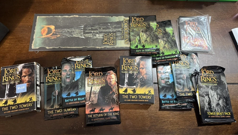 Immerse yourself in the world of Middle-earth with the Lord of the Rings Trading Card Game - The Two Towers Anthology. This set features a variety of multi-color cards featuring characters from the iconic fantasy universe. Whether you're a seasoned collector or a new fan of the series, this anthology is a must-have for any Lord of the Rings enthusiast. The cards are perfect for use in the popular trading card game, or for display in a collector's binder. The detailed artwork and intricate designs on each card capture the essence of the characters and the world they inhabit. Add this set to your collection today and embark on an epic journey through the lands of hobbits, elves, and men. Box has imperfections, see photos. Cards have all been opened previously.