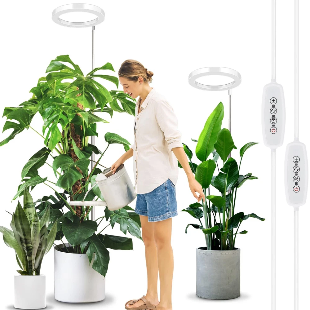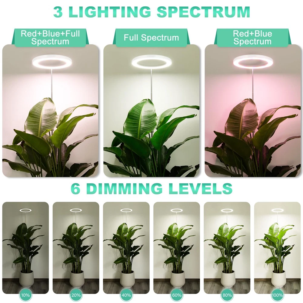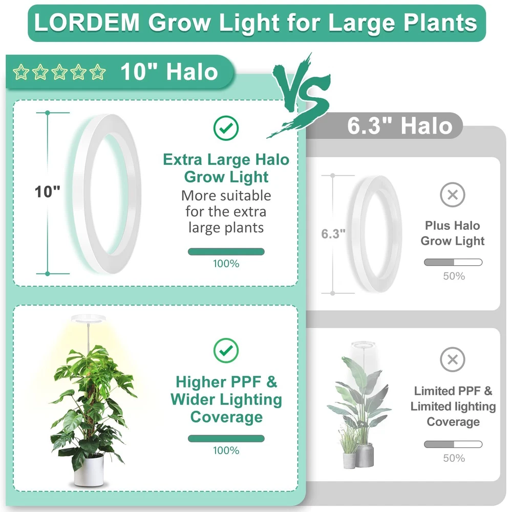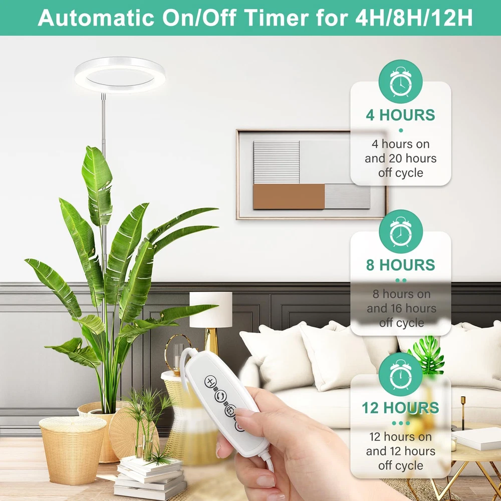 10" Extra Large Size Halo Grow Light: Tailored for larger plants, our 10-inch grow lamp provides the ideal spectrum and intensity to accelerate photosynthesis and plant growth, ensuring your plants flourish year-round. With the super bright 160pcs LEDs, this indoor plant light replicates a full spectrum akin to natural sunlight, promoting robust plant growth. Sunlight Design with 3 Spectrum Modes: This grow light expertly emulates natural sunlight, delivering a full spectrum of light (380nm-800nm) for your plants in all growth stages. It offers three optional color light modes: 5500K (All LEDs On), 5000K (Warm White and Cool White LEDs On), and 2500K (Red and Blue LEDs On). These three spectrum options allow you to customize the lighting to suit your plant's growth stage. You could maximize plants' potential from seedlings to maturity. Auto On/Off Timer and 10 Dimming Levels: Take control of your plants' lighting needs with easy-to-set timed dimming functions. Select from 4, 8, or 12-hour cycles, and the light will automatically turn on/off at your pre-set times. With 10 adjustable brightness levels(10% to a powerful 100%), you have precise control over the lighting intensity. Height Adjustable Plant Lamp: Cater to tall large plants with ease! Our Plant Light offers a maximum height reach of 61 inches, ensuring that even the tallest plants receive the ideal amount of light for their growth. The sturdy pole provides flexibility in adjusting the height. Just push it up or down – a perfect choice for your indoor potted tall plants! Effortless Installation & 106" Long Cabel: Enjoy a hassle-free setup with a generous 106-inch long power cord. Fix the light panel to the pole, and you're ready to nurture your plants. The extended power cord adds convenience, allowing you to place your Plant Grow Light exactly where needed. If you have any questions, please feel free to get in touch with us, we sincerely provide you with the most concerned services and answers to questions.