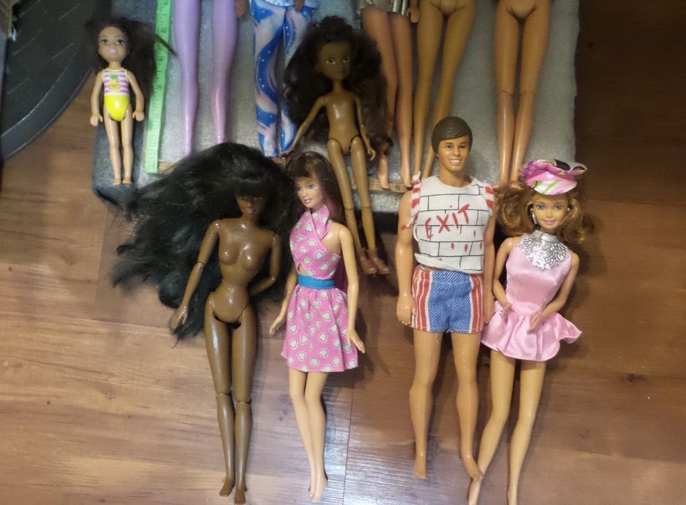 LOT OF 11 Mattel BROWN/BRUNETTE, RED HAIR, AFRICAN AMERICAN Barbie & KEN DOLLS TWO DOLLS ARE SMALLER NOT SURE IF ALL ARE MATTEL ONES SOME ARE VINTAGE OTHERS ARE MORE MODERN SOME ARE MISSING RINGS/EARRINGS SOME WEAR/STAINS ON SOME, I DON'T THINK ANY OF THEM HAD A HAIRCUT THE KEN DOLL HAS SOME TOES CHEWED OFF ON ONE FOOT, AND SOME OF THEIR HAIR MAY NEED TO BE WASHED/CONDITIONED I DO COMBINE SHIPPING IN THE SAME WEEK ONLY ANY ?S FEEL FREE TO ASK