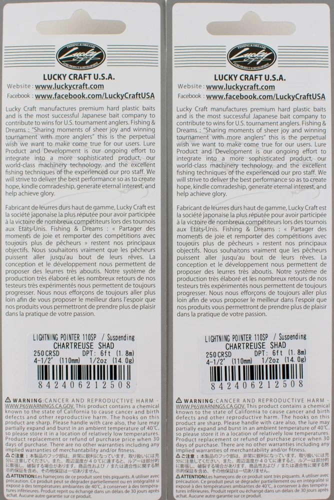 (LOT OF 2) LUCKY CRAFT LIGHTNING POINTER 110SP 1/2OZ CHARTREUSE SHAD I8144 (LOT OF 2) LUCKY CRAFT LIGHTNING POINTER 110SP 1/2OZ CHARTREUSE SHAD I8144 Joining Lucky Craft’s legendary line-up of jerkbaits, the Lucky Craft Lightning Pointer 110SP Jerkbait utilizes the proven performance of the original Lightning Pointer but now able to perfectly suspend when paused for those times when the fish are heavily pressured or lethargic. Internally equipped with special brass weights, Lucky Craft Lightning Pointer 110SP Jerkbait delivers bullet-like casts and features a low center of gravity, which allows the bait to suspend in a neutral position during a stop and go retrieve to tempt wary and less aggressive fish into striking. Its tapered tail design also creates a side-to-side wobbling action at the beginning of each retrieve that accurately mimics the movements of a real baitfish trying to erratically swim away from predators. Incredibly productive in warm and cold water, the Lucky Craft Lightning Pointer 110SP Jerkbait’s perfect suspending action makes it an ideal candidate for both fast retrieves with short pauses and slow retrieves with long pauses depending on the mood of the fish. Finished with premium treble hooks and covered in a highly detailed paint job, the Lucky Craft Lightning Pointer 110SP Jerkbait continues Lucky Craft’s legacy as the best fish-catching jerkbaits ever developed. Length: 4-1/2" Weight: 1/2oz Depth: 6' Type: Suspending Color: Chartreuse Shad Many baits designed in US and all Lures made in Japan High Quality Lures with unusual color offerings Used by Pro Fisherman like Skeet Reese A staple in any fisherman’s tacklebox Lucky Craft Lures – Since 1992 On their packaging, Lucky Craft has a tag line that says the company is all about “Fishing and Dreams.” No one has exhibited that more than Skeet Reese, who recently nailed his second Elite Series win of the year at Guntersville. Lucky Craft evolved in 1992 out of a Japanese manufacturing company that specialized in popular toy robots. They first got into the lure business as the Japanese manufacturer for Daiwa lures, and when Daiwa took their business to Indonesia, starting with the Japanese market. In many ways, they paved the way for other Japanese lure companies to enter the US market, by creating a reputation for high-quality baits with unusual color offerings. The Japan-only lineup features many of the lures that American fishermen will recognize from their tackle box, along with some strange creatures from fan-tailed goldfish to giant bugs. PAYMENT TERMS VISA, MASTERCARD, AMEX, OR DISCOVER PAYPAL APPLE PAY GOOGLE PAY PAYMENTS MUST BE MADE IN FULL WITHIN 7 DAYS SHIPPING TERMS ALL PAID ORDERS SHIP WITHIN 1 BUSINESS DAY INSURANCE IS INCLUDED IN SHIPPING PRICE COMBINED ORDER POLICY ORDERS ARE COMBINED NIGHTLY AFTER END OF ALL AUCTIONS. DO NOT PAY FOR INDIVIDUAL ITEMS ENDING ON THE SAME DATE IF YOU WANT THE ORDER COMBINED. ALLOW US TIME TO SEND YOU A COMBINED INVOICE. ORDERS THAT ARE PAID FOR ON DIFFERENT DATES ARE NOT OUR RESPONSIBILITY TO COMBINE. ITEMS MUST BE PAID IN FULL WITHIN 7 DAYS FROM THE END OF 1ST AUCTION. COMBINED ORDER PRICING BAITS - EACH ADDITIONAL AUCTION $1.00 REELS - EACH ADDITIONAL AUCTION $1.00 RODS* - EACH ADDITIONAL AUCTION $1.00 *ALL RODS WILL ONLY COMBINE WITH RODS OPERATING HOURS BUSINESS HOURS ARE MONDAY - THURSDAY 9AM-5PM CENTRAL TIME & FRIDAY 9AM-3PM CENTRAL TIME, EXCLUDING HOLIDAYS EBAY MESSAGES ARE ANSWERED DURING NORMAL BUSINESS HOURS DUE TO THE OVERWHELMING AMOUNT OF ONLINE ORDERS WE ARE EXPERIENCING, LONGER THAN NORMAL RESPONSE TIME TO EMAILS MAY OCCUR. PLEASE BE PATIENT.