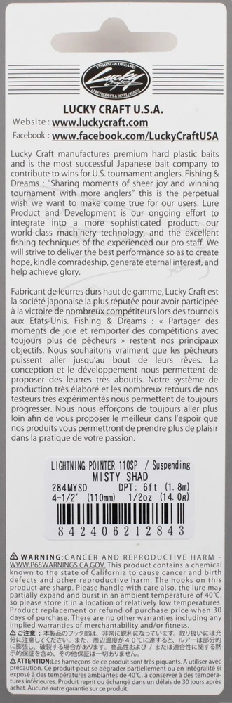 (LOT OF 2) LUCKY CRAFT LIGHTNING POINTER 110SP 1/2OZ LPT110SP-284 MSTY SHD A7343 (LOT OF 2) LUCKY CRAFT LIGHTNING POINTER 110SP 1/2OZ LPT110SP-284 MSTY SHD A7343 Lucky Craft has continuously been producing high-quality world-class jerk baits such as the Pointer, Live Pointer, Slender Pointer, Flash Pointer and much more. And to celebrate our US development 25th anniversary, we have created another powerful jerk bait to be added to our collection - the Lightning Pointer. As it is said in its name, it has an extremely fast beginning action and incredible casting distance like lightning! From these 2 major features, imagine the number of bites you will get. This is definitely Lucky Craft’s best masterpiece of the 21st century! Length: 4-1/2" (112mm) Weight: 1/2oz (14.0g) Depth: 5' - 6' Type: Suspending Color: Misty Shad Many baits designed in US and all Lures made in Japan High Quality Lures with unusual color offerings Used by Pro Fisherman like Skeet Reese A staple in any fisherman’s tacklebox Lucky Craft Lures – Since 1992 On their packaging, Lucky Craft has a tag line that says the company is all about “Fishing and Dreams.” No one has exhibited that more than Skeet Reese, who recently nailed his second Elite Series win of the year at Guntersville. Lucky Craft evolved in 1992 out of a Japanese manufacturing company that specialized in popular toy robots. They first got into the lure business as the Japanese manufacturer for Daiwa lures, and when Daiwa took their business to Indonesia, starting with the Japanese market. In many ways, they paved the way for other Japanese lure companies to enter the US market, by creating a reputation for high-quality baits with unusual color offerings. The Japan-only lineup features many of the lures that American fishermen will recognize from their tackle box, along with some strange creatures from fan-tailed goldfish to giant bugs. PAYMENT TERMS VISA, MASTERCARD, AMEX, OR DISCOVER PAYPAL APPLE PAY GOOGLE PAY PAYMENTS MUST BE MADE IN FULL WITHIN 7 DAYS SHIPPING TERMS ALL PAID ORDERS SHIP WITHIN 1 BUSINESS DAY INSURANCE IS INCLUDED IN SHIPPING PRICE COMBINED ORDER POLICY ORDERS ARE COMBINED NIGHTLY AFTER END OF ALL AUCTIONS. DO NOT PAY FOR INDIVIDUAL ITEMS ENDING ON THE SAME DATE IF YOU WANT THE ORDER COMBINED. ALLOW US TIME TO SEND YOU A COMBINED INVOICE. ORDERS THAT ARE PAID FOR ON DIFFERENT DATES ARE NOT OUR RESPONSIBILITY TO COMBINE. ITEMS MUST BE PAID IN FULL WITHIN 7 DAYS FROM THE END OF 1ST AUCTION. COMBINED ORDER PRICING BAITS - EACH ADDITIONAL AUCTION $1.00 REELS - EACH ADDITIONAL AUCTION $1.00 RODS* - EACH ADDITIONAL AUCTION $1.00 *ALL RODS WILL ONLY COMBINE WITH RODS OPERATING HOURS BUSINESS HOURS ARE MONDAY - THURSDAY 9AM-5PM CENTRAL TIME & FRIDAY 9AM-3PM CENTRAL TIME, EXCLUDING HOLIDAYS EBAY MESSAGES ARE ANSWERED DURING NORMAL BUSINESS HOURS DUE TO THE OVERWHELMING AMOUNT OF ONLINE ORDERS WE ARE EXPERIENCING, LONGER THAN NORMAL RESPONSE TIME TO EMAILS MAY OCCUR. PLEASE BE PATIENT.