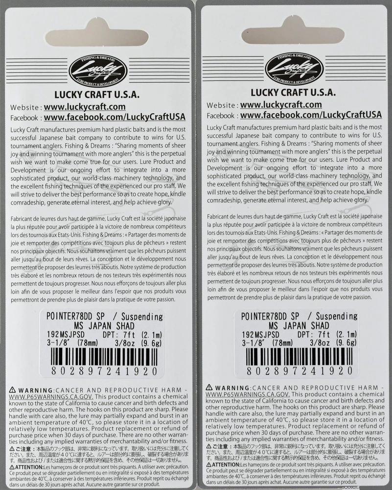 (LOT OF 2) LUCKY CRAFT POINTER 78DD 3/8OZ PT78DDSP-192 MS JAPAN SHAD I9231 (LOT OF 2) LUCKY CRAFT POINTER 78DD 3/8OZ PT78DDSP-192 MS JAPAN SHAD I9231 The POINTER DD has been designed with a very low center of gravity through the use of special brass weights. The low center of balance causes the lure to wobble and vibrate whenever the retrieving motion is stopped. The POINTER will suspend 7 -8 feet deep and will emit an intriguing bass-calling vibration, while in the suspended state. A short twitch of the fishing rod will generate the "Walk the Dog" action under the water. Length: 3-1/8" Weight: 3/8oz Depth: 7ft Class: Suspending Many baits designed in the US and all Lures made in Japan High Quality Lures with unusual color offerings Used by Pro Fisherman like Skeet Reese A staple in any fisherman’s tacklebox Lucky Craft Lures – Since 1992 On their packaging, Lucky Craft has a tag line that says the company is all about “Fishing and Dreams.” No one has exhibited that more than Skeet Reese, who recently nailed his second Elite Series win of the year at Guntersville. Lucky Craft evolved in 1992 out of a Japanese manufacturing company that specialized in popular toy robots. They first got into the lure business as the Japanese manufacturer for Daiwa lures, and when Daiwa took their business to Indonesia, starting with the Japanese market. In many ways, they paved the way for other Japanese lure companies to enter the US market, by creating a reputation for high-quality baits with unusual color offerings. The Japan-only lineup features many of the lures that American fishermen will recognize from their tackle box, along with some strange creatures from fan-tailed goldfish to giant bugs. PAYMENT TERMS VISA, MASTERCARD, AMEX, OR DISCOVER PAYPAL APPLE PAY GOOGLE PAY PAYMENTS MUST BE MADE IN FULL WITHIN 7 DAYS SHIPPING TERMS ALL PAID ORDERS SHIP WITHIN 1 BUSINESS DAY INSURANCE IS INCLUDED IN SHIPPING PRICE COMBINED ORDER POLICY ORDERS ARE COMBINED NIGHTLY AFTER END OF ALL AUCTIONS. DO NOT PAY FOR INDIVIDUAL ITEMS ENDING ON THE SAME DATE IF YOU WANT THE ORDER COMBINED. ALLOW US TIME TO SEND YOU A COMBINED INVOICE. ORDERS THAT ARE PAID FOR ON DIFFERENT DATES ARE NOT OUR RESPONSIBILITY TO COMBINE. ITEMS MUST BE PAID IN FULL WITHIN 7 DAYS FROM THE END OF 1ST AUCTION. COMBINED ORDER PRICING BAITS - EACH ADDITIONAL AUCTION $1.00 REELS - EACH ADDITIONAL AUCTION $1.00 RODS* - EACH ADDITIONAL AUCTION $1.00 *ALL RODS WILL ONLY COMBINE WITH RODS OPERATING HOURS BUSINESS HOURS ARE MONDAY - THURSDAY 9AM-5PM CENTRAL TIME & FRIDAY 9AM-3PM CENTRAL TIME, EXCLUDING HOLIDAYS EBAY MESSAGES ARE ANSWERED DURING NORMAL BUSINESS HOURS DUE TO THE OVERWHELMING AMOUNT OF ONLINE ORDERS WE ARE EXPERIENCING, LONGER THAN NORMAL RESPONSE TIME TO EMAILS MAY OCCUR. PLEASE BE PATIENT.