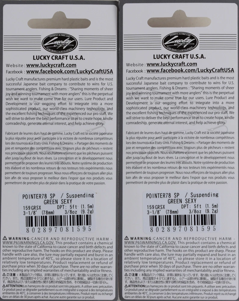 (LOT OF 2) LUCKY CRAFT POINTER 78SP 3/8OZ PT78SP-159 GREEN SEXY H2220 (LOT OF 2) LUCKY CRAFT POINTER 78SP 3/8OZ PT78SP-159 GREEN SEXY H2220 The POINTER has been designed with a very low center of gravity through the use of special brass weights. The low center of balance causes the lure to wobble and vibrate whenever the retrieving motion is stopped. The POINTER will suspend 4 -5 feet deep and will emit an intriguing bass-calling vibration, while in the suspended state. A short twitch of the fishing rod will generate the "Walk the Dog" action under the water. Length: 3 1/8" (78mm) Weight: 3/8oz.(9.2g) Depth: 5ft Type: Suspending PAYMENT TERMS VISA, MASTERCARD, AMEX, OR DISCOVER PAYPAL APPLE PAY GOOGLE PAY PAYMENTS MUST BE MADE IN FULL WITHIN 7 DAYS SHIPPING TERMS ALL PAID ORDERS SHIP WITHIN 1 BUSINESS DAY INSURANCE IS INCLUDED IN SHIPPING PRICE COMBINED ORDER POLICY ORDERS ARE COMBINED NIGHTLY AFTER END OF ALL AUCTIONS. DO NOT PAY FOR INDIVIDUAL ITEMS ENDING ON THE SAME DATE IF YOU WANT THE ORDER COMBINED. ALLOW US TIME TO SEND YOU A COMBINED INVOICE. ORDERS THAT ARE PAID FOR ON DIFFERENT DATES ARE NOT OUR RESPONSIBILITY TO COMBINE. ITEMS MUST BE PAID IN FULL WITHIN 7 DAYS FROM THE END OF 1ST AUCTION. COMBINED ORDER PRICING BAITS - EACH ADDITIONAL AUCTION $1.00 REELS - EACH ADDITIONAL AUCTION $1.00 RODS* - EACH ADDITIONAL AUCTION $1.00 *ALL RODS WILL ONLY COMBINE WITH RODS OPERATING HOURS BUSINESS HOURS ARE MONDAY - THURSDAY 9AM-5PM CENTRAL TIME & FRIDAY 9AM-3PM CENTRAL TIME, EXCLUDING HOLIDAYS EBAY MESSAGES ARE ANSWERED DURING NORMAL BUSINESS HOURS DUE TO THE OVERWHELMING AMOUNT OF ONLINE ORDERS WE ARE EXPERIENCING, LONGER THAN NORMAL RESPONSE TIME TO EMAILS MAY OCCUR. PLEASE BE PATIENT.