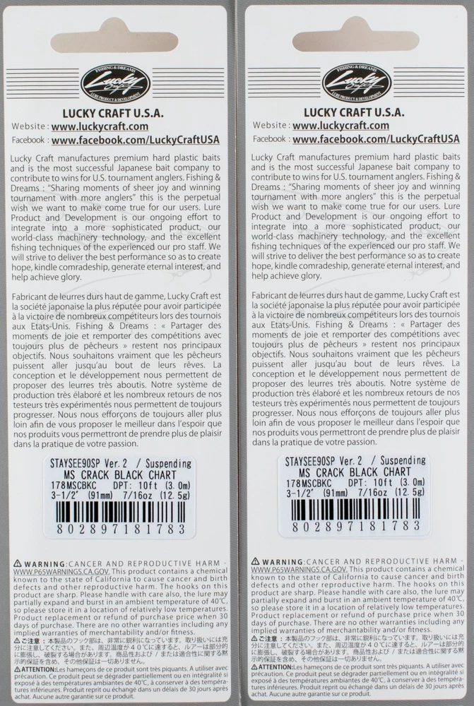(LOT OF 2) LUCKY CRAFT STAYSEE 90SP V2 7/16OZ SS90SPV2-178 MS CRA BLK CHAR D2154 (LOT OF 2) LUCKY CRAFT STAYSEE 90SP V2 7/16OZ SS90SPV2-178 MS CRA BLK CHAR D2154 The STAYSEE 90SP is a very special bass attracting jerk-bait. Unlike many jerk-baits that are ripped across the surface of the water, this bait is fished 8-10 feet below the surface with a perfect nose-down and suspend retrieve. The STAYSEE 90SP is equipped with a unique combination of rattles, which create the gravity suspending action and permits long casts. The STAYSEE 90SP is available in eight colors making this suspending jerk-bait a very effective and exciting lure. Length: 3.5" Weight: 7/16oz Depth: 10ft Type: Suspending Color: MS Crack Black Chartreuse Many baits designed in US and all Lures made in Japan High Quality Lures with unusual color offerings Used by Pro Fisherman like Skeet Reese A staple in any fisherman’s tacklebox Lucky Craft Lures – Since 1992 On their packaging, Lucky Craft has a tag line that says the company is all about “Fishing and Dreams.” No one has exhibited that more than Skeet Reese, who recently nailed his second Elite Series win of the year at Guntersville. Lucky Craft evolved in 1992 out of a Japanese manufacturing company that specialized in popular toy robots. They first got into the lure business as the Japanese manufacturer for Daiwa lures, and when Daiwa took their business to Indonesia, starting with the Japanese market. In many ways, they paved the way for other Japanese lure companies to enter the US market, by creating a reputation for high-quality baits with unusual color offerings. The Japan-only lineup features many of the lures that American fishermen will recognize from their tackle box, along with some strange creatures from fan-tailed goldfish to giant bugs. PAYMENT TERMS VISA, MASTERCARD, AMEX, OR DISCOVER PAYPAL APPLE PAY GOOGLE PAY PAYMENTS MUST BE MADE IN FULL WITHIN 7 DAYS SHIPPING TERMS ALL PAID ORDERS SHIP WITHIN 1 BUSINESS DAY INSURANCE IS INCLUDED IN SHIPPING PRICE COMBINED ORDER POLICY ORDERS ARE COMBINED NIGHTLY AFTER END OF ALL AUCTIONS. DO NOT PAY FOR INDIVIDUAL ITEMS ENDING ON THE SAME DATE IF YOU WANT THE ORDER COMBINED. ALLOW US TIME TO SEND YOU A COMBINED INVOICE. ORDERS THAT ARE PAID FOR ON DIFFERENT DATES ARE NOT OUR RESPONSIBILITY TO COMBINE. ITEMS MUST BE PAID IN FULL WITHIN 7 DAYS FROM THE END OF 1ST AUCTION. COMBINED ORDER PRICING BAITS - EACH ADDITIONAL AUCTION $1.00 REELS - EACH ADDITIONAL AUCTION $1.00 RODS* - EACH ADDITIONAL AUCTION $1.00 *ALL RODS WILL ONLY COMBINE WITH RODS OPERATING HOURS BUSINESS HOURS ARE MONDAY - THURSDAY 9AM-5PM CENTRAL TIME & FRIDAY 9AM-3PM CENTRAL TIME, EXCLUDING HOLIDAYS EBAY MESSAGES ARE ANSWERED DURING NORMAL BUSINESS HOURS DUE TO THE OVERWHELMING AMOUNT OF ONLINE ORDERS WE ARE EXPERIENCING, LONGER THAN NORMAL RESPONSE TIME TO EMAILS MAY OCCUR. PLEASE BE PATIENT.