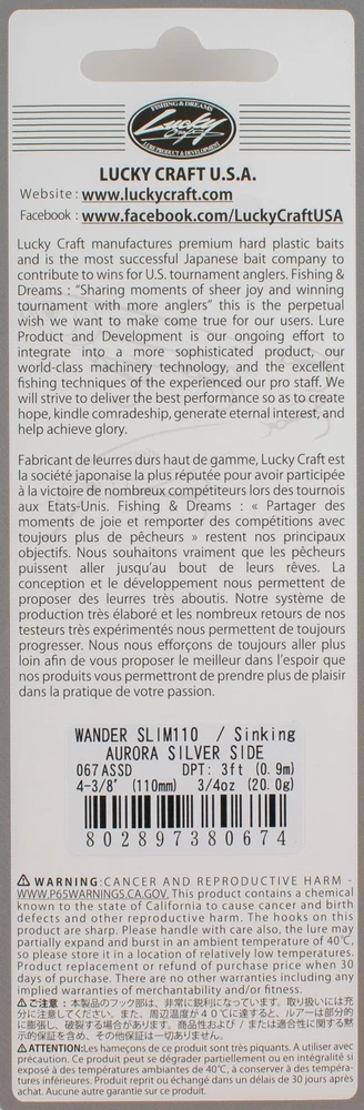 (LOT OF 2) LUCKY CRAFT WANDER SLIM 110 3/4OZ WDS110-067 AURORA SILVER SIDE B6120 (LOT OF 2) LUCKY CRAFT WANDER SLIM 110 3/4OZ WDS110-067 AURORA SILVER SIDE B6120 The Lucky Craft's WANDER is a natural swimming bait originating from a concept such as the Lipless Minnow and Jigging Minnow. Just throw it in the water and begin reeling it very slowly. The WANDER will move just below the water surface, rolling its body as it goes. Also, this lure converts your commands into realistic action. Let it fall to the desired depth of the water and twitch it. The WANDER falls horizontally by wobbling its body. The WANDER will hook you into the Wander World of Angling performance made possible by Lucky Craft. Length: 4-3/8" Weight: 3/4oz Class: Sinking Depth: 3ft Many lures designed in the US - Made in Japan High Quality Lures with unusual color offerings Used by Pro Fisherman like Skeet Reese A great brand to have in your tackle box Lucky Craft - Exceptional tackle since 1992 On their packaging, Lucky Craft has a tag line that says the company is all about Fishing and Dreams. No one has exhibited that more than Skeet Reese, who recently nailed his second Elite series win of the year at Guntersville using Lucky Craft Lures. Lucky Craft evolved in 1992 out of a Japanese manufacturing company that specialized in popular toy robots. They first got into the lure business as the Japanese manufacturer for Daiwa lures, and when Daiwa took their business to Indonesia, they decided to create their own line, starting with the Japanese market. In many ways, they paved the way for other Japanese lure companies to enter the US market, by creating a reputation for high-quality baits with unusual color offerings. The Japan-only lineup features many of the lures that American fishermen will recognize from their tackle box, along with some strange creatures from fan-tailed goldfish to giant bugs. PAYMENT TERMS VISA, MASTERCARD, AMEX, OR DISCOVER PAYPAL APPLE PAY GOOGLE PAY PAYMENTS MUST BE MADE IN FULL WITHIN 7 DAYS SHIPPING TERMS ALL PAID ORDERS SHIP WITHIN 1 BUSINESS DAY INSURANCE IS INCLUDED IN SHIPPING PRICE COMBINED ORDER POLICY ORDERS ARE COMBINED NIGHTLY AFTER END OF ALL AUCTIONS. DO NOT PAY FOR INDIVIDUAL ITEMS ENDING ON THE SAME DATE IF YOU WANT THE ORDER COMBINED. ALLOW US TIME TO SEND YOU A COMBINED INVOICE. ORDERS THAT ARE PAID FOR ON DIFFERENT DATES ARE NOT OUR RESPONSIBILITY TO COMBINE. ITEMS MUST BE PAID IN FULL WITHIN 7 DAYS FROM THE END OF 1ST AUCTION. COMBINED ORDER PRICING BAITS - EACH ADDITIONAL AUCTION $1.00 REELS - EACH ADDITIONAL AUCTION $1.00 RODS* - EACH ADDITIONAL AUCTION $1.00 *ALL RODS WILL ONLY COMBINE WITH RODS OPERATING HOURS BUSINESS HOURS ARE MONDAY - THURSDAY 9AM-5PM CENTRAL TIME & FRIDAY 9AM-3PM CENTRAL TIME, EXCLUDING HOLIDAYS EBAY MESSAGES ARE ANSWERED DURING NORMAL BUSINESS HOURS DUE TO THE OVERWHELMING AMOUNT OF ONLINE ORDERS WE ARE EXPERIENCING, LONGER THAN NORMAL RESPONSE TIME TO EMAILS MAY OCCUR. PLEASE BE PATIENT.