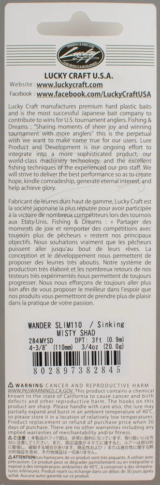 (LOT OF 2) LUCKY CRAFT WANDER SLIM 110 3/4OZ WDS110-284 MISTY SHAD B6201 (LOT OF 2) LUCKY CRAFT WANDER SLIM 110 3/4OZ WDS110-284 MISTY SHAD B6201 The Lucky Craft's WANDER is a natural swimming bait originating from a concept such as the Lipless Minnow and Jigging Minnow. Just throw it in the water and begin reeling it very slowly. The WANDER will move just below the water surface, rolling its body as it goes. Also, this lure converts your commands into realistic action. Let it fall to the desired depth of the water and twitch it. The WANDER falls horizontally by wobbling its body. The WANDER will hook you into the Wander World of Angling performance made possible by Lucky Craft. Length: 4-3/8" Weight: 3/4oz Class: Sinking Depth: 3ft Many lures designed in the US - Made in Japan High Quality Lures with unusual color offerings Used by Pro Fisherman like Skeet Reese A great brand to have in your tackle box Lucky Craft - Exceptional tackle since 1992 On their packaging, Lucky Craft has a tag line that says the company is all about Fishing and Dreams. No one has exhibited that more than Skeet Reese, who recently nailed his second Elite series win of the year at Guntersville using Lucky Craft Lures. Lucky Craft evolved in 1992 out of a Japanese manufacturing company that specialized in popular toy robots. They first got into the lure business as the Japanese manufacturer for Daiwa lures, and when Daiwa took their business to Indonesia, they decided to create their own line, starting with the Japanese market. In many ways, they paved the way for other Japanese lure companies to enter the US market, by creating a reputation for high-quality baits with unusual color offerings. The Japan-only lineup features many of the lures that American fishermen will recognize from their tackle box, along with some strange creatures from fan-tailed goldfish to giant bugs. PAYMENT TERMS VISA, MASTERCARD, AMEX, OR DISCOVER PAYPAL APPLE PAY GOOGLE PAY PAYMENTS MUST BE MADE IN FULL WITHIN 7 DAYS SHIPPING TERMS ALL PAID ORDERS SHIP WITHIN 1 BUSINESS DAY INSURANCE IS INCLUDED IN SHIPPING PRICE COMBINED ORDER POLICY ORDERS ARE COMBINED NIGHTLY AFTER END OF ALL AUCTIONS. DO NOT PAY FOR INDIVIDUAL ITEMS ENDING ON THE SAME DATE IF YOU WANT THE ORDER COMBINED. ALLOW US TIME TO SEND YOU A COMBINED INVOICE. ORDERS THAT ARE PAID FOR ON DIFFERENT DATES ARE NOT OUR RESPONSIBILITY TO COMBINE. ITEMS MUST BE PAID IN FULL WITHIN 7 DAYS FROM THE END OF 1ST AUCTION. COMBINED ORDER PRICING BAITS - EACH ADDITIONAL AUCTION $1.00 REELS - EACH ADDITIONAL AUCTION $1.00 RODS* - EACH ADDITIONAL AUCTION $1.00 *ALL RODS WILL ONLY COMBINE WITH RODS OPERATING HOURS BUSINESS HOURS ARE MONDAY - THURSDAY 9AM-5PM CENTRAL TIME & FRIDAY 9AM-3PM CENTRAL TIME, EXCLUDING HOLIDAYS EBAY MESSAGES ARE ANSWERED DURING NORMAL BUSINESS HOURS DUE TO THE OVERWHELMING AMOUNT OF ONLINE ORDERS WE ARE EXPERIENCING, LONGER THAN NORMAL RESPONSE TIME TO EMAILS MAY OCCUR. PLEASE BE PATIENT.