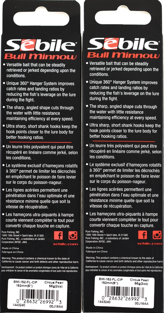 (LOT OF 2) SEBILE BULL MINNOW BMI-152-FL-CIP 2OZ 1443240 CIRCUS PEARL BM7303 (LOT OF 2) SEBILE BULL MINNOW BMI-152-FL-CIP 2OZ 1443240 CIRCUS PEARL BM7303 Description The Sebile Bull Minnow is a wide action bait that is ideal for power fishing (Retrieving/jerking/pulling) situations when fish are active. The Bull Minnow is designed to be versatile. As a power jerkbait, the Bull Minnow is designed to handle aggressive fishing by anglers. The Bull Minnow can be retrieved at high speeds while remaining stable and tracking true! Features Versatile bait that can be steadily retrieved or jerked depending upon the conditions The sharp, angled shape cuts through the water with little resistance maintaining efficiency at every speed Designed with a 360-degree rotating belly hook preventing fish from gaining leverage and throwing bait Constant action is ideal for cast and retrieves techniques Tail weighted design casting distance Rocket version geared to make super long casts and includes extra single hooks LENGTH: 6" WEIGHT: 2 OZ HOOK SIZE: 3/0 SWIMMING DEPTH: 2'-4'' PAYMENT TERMS VISA, MASTERCARD, AMEX, OR DISCOVER PAYPAL APPLE PAY GOOGLE PAY PAYMENTS MUST BE MADE IN FULL WITHIN 7 DAYS SHIPPING TERMS ALL PAID ORDERS SHIP WITHIN 1 BUSINESS DAY INSURANCE IS INCLUDED IN SHIPPING PRICE COMBINED ORDER POLICY ORDERS ARE COMBINED NIGHTLY AFTER END OF ALL AUCTIONS. DO NOT PAY FOR INDIVIDUAL ITEMS ENDING ON THE SAME DATE IF YOU WANT THE ORDER COMBINED. ALLOW US TIME TO SEND YOU A COMBINED INVOICE. ORDERS THAT ARE PAID FOR ON DIFFERENT DATES ARE NOT OUR RESPONSIBILITY TO COMBINE. ITEMS MUST BE PAID IN FULL WITHIN 7 DAYS FROM THE END OF 1ST AUCTION. COMBINED ORDER PRICING BAITS - EACH ADDITIONAL AUCTION $1.00 REELS - EACH ADDITIONAL AUCTION $1.00 RODS* - EACH ADDITIONAL AUCTION $1.00 *ALL RODS WILL ONLY COMBINE WITH RODS OPERATING HOURS BUSINESS HOURS ARE MONDAY - THURSDAY 9AM-5PM CENTRAL TIME & FRIDAY 9AM-3PM CENTRAL TIME, EXCLUDING HOLIDAYS EBAY MESSAGES ARE ANSWERED DURING NORMAL BUSINESS HOURS DUE TO THE OVERWHELMING AMOUNT OF ONLINE ORDERS WE ARE EXPERIENCING, LONGER THAN NORMAL RESPONSE TIME TO EMAILS MAY OCCUR. PLEASE BE PATIENT.