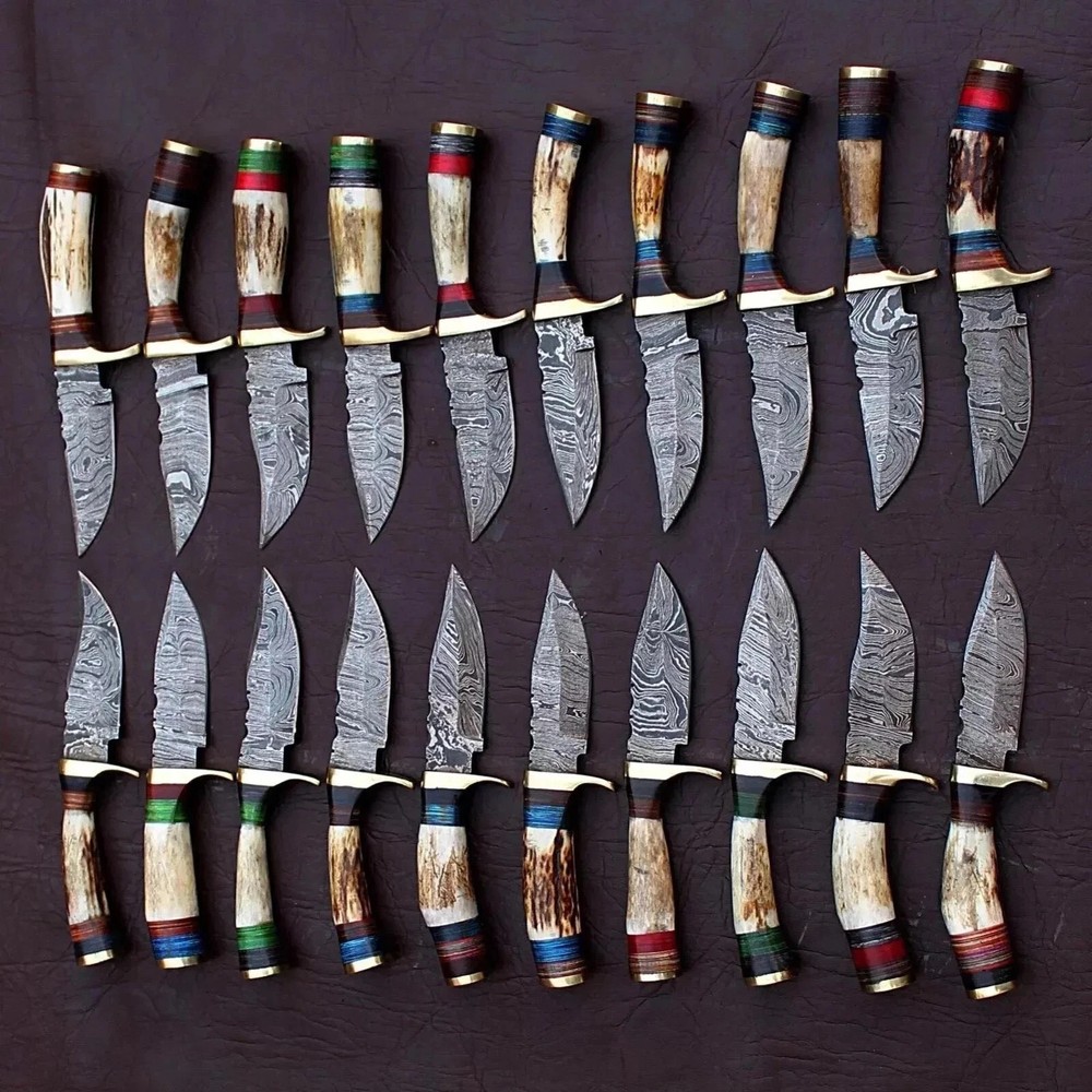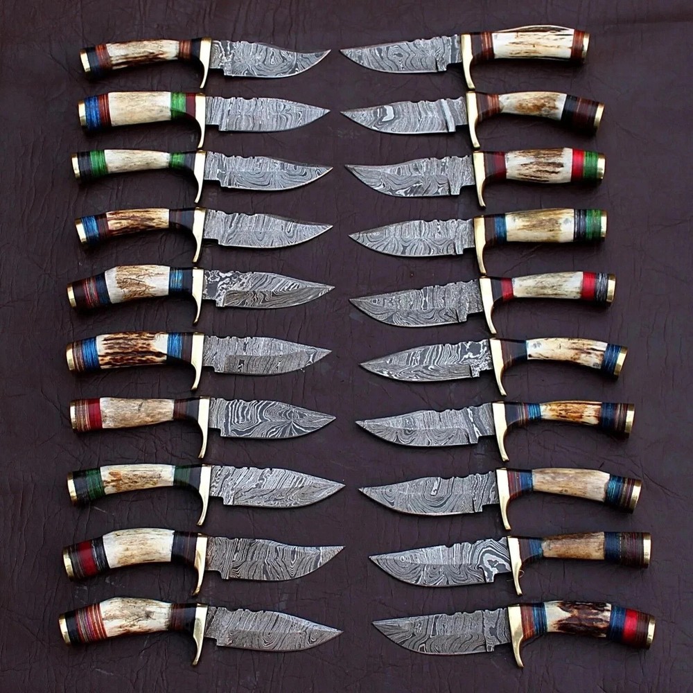 MARVELLOUS LOT OF "20" CUSTOM HANDMADE FORGED DAMASCUS STEEL TWISTED PATTER SHARPENED EDGE FULL TANG BLADE EDC CAMPING HUNTING CAMPING SKINNER KNIVES IN STAG HORN & BRASS HAND GUARD HANDLE. MEASUREMENT: OVERALL LENGHT: 6.00 INCHES (APPROX.) BLADE LENGTH: 3.00 INCHES (APPROX.) HANDLE LENGHT: 3.00 INCHES (APPROX.) FEATURES: Sharp Edge Easy to Carry Smooth Grip And Long Lasting Useable Knife For Hunting and Outdoors Man. HAND FORGED DAMASCUS BLADES: Damascus blades are hand forged through a process of layering, melting and hammering. This results in each blade having a unique design or as some would say a "fingerprint". Each & every knife is truly one of a kind. Damascus steel has outstanding properties of strength and hardness. We amplify its properties by oil quenching it at 2100 deg F to cool it down fast and we do it twice to make sure it's hard to its inner core to withstand any kind of work you may put it to use. It achieves a 58 or higher HRC on the Rockwell Scale. Producing Damascus steel is still unknown to this day, the process has been lost over the past 500 years. Today, we layer & hand forge two different steels 15n20 & 1095. It is then dipped in Ferric Chloride creating a distinct reaction with the metals producing a Damascus like pattern. 【 PATENTED DESIGN】 Manufactured with ultra-sharp hand forged Damascus steel cutting core at HRC58-60 hardness, this knife comes with unrivaled performance and incredible edge retention. 【 HIGH QUALITY HANDMADE KNIFE WITH SHARP, STRONG, AND DURABLE BLADE 】 This knife was hand crafted with the highest attention to detail to create this unique sharp blade with a sturdy handle. This knife is made of high-quality Damascus steel and will not rust with proper care. 【 PERFECT OUTDOOR CAMPING KNIFE AND HUNTING KNIFE 】 This knife is the perfect camp knife and hunting knife. It’s the best knife for any hunter, camper, survivalist, or outdoor sports enthusiast so that you can enjoy your adventure. 【 EXCELLENT HANDMADE BUSH CRAFT KNIFE 】 The Perfect bush craft, camp survival knife for all of your most rugged adventures out in the wild. This survival knife will give you an edge so that you can win in the competition against the wild outdoors. 【 DECORATIVE EDC HUNTING KNIFE FOR COLLECTORS 】 Enrich your collection with this beautifully forged handmade Damascus knife that is sure to impress with its hand forged layers of premium steel and handle. It’s the perfect addition for any true knife collector. 【 COMFORTABLE AND ERGONOMIC DESIGN FOR EASY GRIP 】 The unique handle is handcrafted for maximum comfort making it the perfect knife for all of your outdoor needs. Full hollow blade is light weight and compliments the handle in maintaining balance and help to reduce stress on your hands after use with comfort while providing you with the perfect blend of performance and comfort. 【 ULTIMATELY DURABLE HANDLE 】 The meticulously constructed handle has gone through special treatment, making it extremely impervious to heat, moisture, cold with military grade strength and life-long sturdiness; multiple times riveted for extra resilience, 【 SUPERIOR SHARPNESS 】 Ruthlessly shaving sharp edge is handcrafted by me to a mirror polish at 15-25° per side using the traditional 3-step honing method. 【 WARRANTY 】 No premium knife is complete without a lifetime warranty; our masterpiece knife is fully covered for life, free exchange or return for life if the item is defective. 【 SUPERIOR SHARPNESS 】 Ruthlessly shaving sharp edge is handcrafted by me to a mirror polish at 15-25° per side using the traditional 3-step honing method. 【 WARRANTY 】 No premium knife is complete without a lifetime warranty; our masterpiece knife is fully covered for life, free exchange or return for life if the item is defective. This knife looks great in the sheath or on a belt making it easy to retrieve. It has the perfect sharpness to make your everyday utilitarian tasks an enjoyable experience. Perfect for hunting, fishing, hiking, camping, boating, backpacking, or any other outdoor adventure. It is also a key item to add to your survival tactical gear!