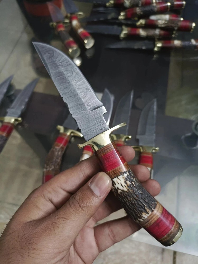 MARVELLOUS LOT OF "20" CUSTOM HANDMADE FORGED DAMASCUS STEEL TWISTED PATTER SHARPENED EDGE FULL TANG BLADE EDC CAMPING HUNTING CAMPING SKINNER KNIVES IN STAG HORN , MIX SHEET WOOD & BRASS HAND GUARD HANDLE. MEASUREMENT: OVERALL LENGHT: 8.00 INCHES (APPROX.) BLADE LENGTH: 4.00 INCHES (APPROX.) HANDLE LENGHT: 4.00 INCHES (APPROX.) FEATURES: Sharp Edge Easy to Carry Smooth Grip And Long Lasting Useable Knife For Hunting and Outdoors Man. HAND FORGED DAMASCUS BLADES: Damascus blades are hand forged through a process of layering, melting and hammering. This results in each blade having a unique design or as some would say a "fingerprint". Each & every knife is truly one of a kind. Damascus steel has outstanding properties of strength and hardness. We amplify its properties by oil quenching it at 2100 deg F to cool it down fast and we do it twice to make sure it's hard to its inner core to withstand any kind of work you may put it to use. It achieves a 58 or higher HRC on the Rockwell Scale. Producing Damascus steel is still unknown to this day, the process has been lost over the past 500 years. Today, we layer & hand forge two different steels 15n20 & 1095. It is then dipped in Ferric Chloride creating a distinct reaction with the metals producing a Damascus like pattern. ✅ 【 PATENTED DESIGN】 Manufactured with ultra-sharp hand forged Damascus steel cutting core at HRC58-60 hardness, this knife comes with unrivaled performance and incredible edge retention. ✅【 HIGH QUALITY HANDMADE KNIFE WITH SHARP, STRONG, AND DURABLE BLADE 】 This knife was hand crafted with the highest attention to detail to create this unique sharp blade with a sturdy handle. This knife is made of high-quality Damascus steel and will not rust with proper care. ✅ 【 PERFECT OUTDOOR CAMPING KNIFE AND HUNTING KNIFE 】 This knife is the perfect camp knife and hunting knife. It’s the best knife for any hunter, camper, survivalist, or outdoor sports enthusiast so that you can enjoy your adventure. ✅ 【 EXCELLENT HANDMADE BUSH CRAFT KNIFE 】 The Perfect bush craft, camp survival knife for all of your most rugged adventures out in the wild. This survival knife will give you an edge so that you can win in the competition against the wild outdoors. ✅ 【 DECORATIVE EDC HUNTING KNIFE FOR COLLECTORS 】 Enrich your collection with this beautifully forged handmade Damascus knife that is sure to impress with its hand forged layers of premium steel and handle. It’s the perfect addition for any true knife collector. ✅ 【 COMFORTABLE AND ERGONOMIC DESIGN FOR EASY GRIP 】 The unique handle is handcrafted for maximum comfort making it the perfect knife for all of your outdoor needs. Full hollow blade is light weight and compliments the handle in maintaining balance and help to reduce stress on your hands after use with comfort while providing you with the perfect blend of performance and comfort. ✅ 【 ULTIMATELY DURABLE HANDLE 】 The meticulously constructed handle has gone through special treatment, making it extremely impervious to heat, moisture, cold with military grade strength and life-long sturdiness; multiple times riveted for extra resilience, ✅ 【 SUPERIOR SHARPNESS 】 Ruthlessly shaving sharp edge is handcrafted by me to a mirror polish at 15-25° per side using the traditional 3-step honing method. ✅ 【 WARRANTY 】 No premium knife is complete without a lifetime warranty; our masterpiece knife is fully covered for life, free exchange or return for life if the item is defective. ✅ 【 SUPERIOR SHARPNESS 】 Ruthlessly shaving sharp edge is handcrafted by me to a mirror polish at 15-25° per side using the traditional 3-step honing method. ✅ 【 WARRANTY 】 No premium knife is complete without a lifetime warranty; our masterpiece knife is fully covered for life, free exchange or return for life if the item is defective. This knife looks great in the sheath or on a belt making it easy to retrieve. It has the perfect sharpness to make your everyday utilitarian tasks an enjoyable experience. Perfect for hunting, fishing, hiking, camping, boating, backpacking, or any other outdoor adventure. It is also a key item to add to your survival tactical gear!