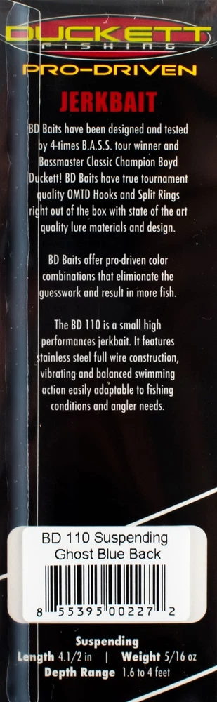 (LOT OF 3) DUCKETT PRO DRIVEN BD 110 JERKBAIT BD110GBB GHOST BLUE BACK L4207 (LOT OF 3) DUCKETT PRO DRIVEN BD 110 JERKBAIT BD110GBB GHOST BLUE BACK L4207 The BD 110 is small high performance jerkbait. It features stainless steel full wire construction, vibrating and balanced swimming action easily adaptable to fishing conditions and angler needs. BD Baits have been designed and tested by 4-time B.A.S.S tour winner and Bassmaster Classic Champ Boyd Duckett! BD Baits have true tourney quality OMTD hooks and split rings right out of the box with state of the art quality lure materials and design. BD Baits offer pro-driven color combinations that eliminate the guesswork and result in more fish! Specs Length: 4.5" Weight: 5/16oz Depth: 1.6'-4' Action: Suspending PAYMENT TERMS VISA, MASTERCARD, AMEX, OR DISCOVER PAYPAL APPLE PAY GOOGLE PAY PAYMENTS MUST BE MADE IN FULL WITHIN 7 DAYS SHIPPING TERMS ALL PAID ORDERS SHIP WITHIN 1 BUSINESS DAY INSURANCE IS INCLUDED IN SHIPPING PRICE COMBINED ORDER POLICY ORDERS ARE COMBINED NIGHTLY AFTER END OF ALL AUCTIONS. DO NOT PAY FOR INDIVIDUAL ITEMS ENDING ON THE SAME DATE IF YOU WANT THE ORDER COMBINED. ALLOW US TIME TO SEND YOU A COMBINED INVOICE. ORDERS THAT ARE PAID FOR ON DIFFERENT DATES ARE NOT OUR RESPONSIBILITY TO COMBINE. ITEMS MUST BE PAID IN FULL WITHIN 7 DAYS FROM THE END OF 1ST AUCTION. COMBINED ORDER PRICING BAITS - EACH ADDITIONAL AUCTION $1.00 REELS - EACH ADDITIONAL AUCTION $1.00 RODS* - EACH ADDITIONAL AUCTION $1.00 *ALL RODS WILL ONLY COMBINE WITH RODS OPERATING HOURS BUSINESS HOURS ARE MONDAY - THURSDAY 9AM-5PM CENTRAL TIME & FRIDAY 9AM-3PM CENTRAL TIME, EXCLUDING HOLIDAYS EBAY MESSAGES ARE ANSWERED DURING NORMAL BUSINESS HOURS DUE TO THE OVERWHELMING AMOUNT OF ONLINE ORDERS WE ARE EXPERIENCING, LONGER THAN NORMAL RESPONSE TIME TO EMAILS MAY OCCUR. PLEASE BE PATIENT.