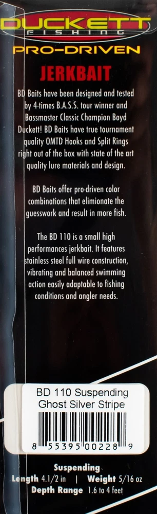 (LOT OF 3) DUCKETT PRO DRIVEN BD 110 JERKBAIT BD110GSS GHOST SILVER STRIPE L4201 (LOT OF 3) DUCKETT PRO DRIVEN BD 110 JERKBAIT BD110GSS GHOST SILVER STRIPE L4201 The BD 110 is small high performance jerkbait. It features stainless steel full wire construction, vibrating and balanced swimming action easily adaptable to fishing conditions and angler needs. BD Baits have been designed and tested by 4-time B.A.S.S tour winner and Bassmaster Classic Champ Boyd Duckett! BD Baits have true tourney quality OMTD hooks and split rings right out of the box with state of the art quality lure materials and design. BD Baits offer pro-driven color combinations that eliminate the guesswork and result in more fish! Specs Length: 4.5" Weight: 5/16oz Depth: 1.6'-4' Action: Suspending PAYMENT TERMS VISA, MASTERCARD, AMEX, OR DISCOVER PAYPAL APPLE PAY GOOGLE PAY PAYMENTS MUST BE MADE IN FULL WITHIN 7 DAYS SHIPPING TERMS ALL PAID ORDERS SHIP WITHIN 1 BUSINESS DAY INSURANCE IS INCLUDED IN SHIPPING PRICE COMBINED ORDER POLICY ORDERS ARE COMBINED NIGHTLY AFTER END OF ALL AUCTIONS. DO NOT PAY FOR INDIVIDUAL ITEMS ENDING ON THE SAME DATE IF YOU WANT THE ORDER COMBINED. ALLOW US TIME TO SEND YOU A COMBINED INVOICE. ORDERS THAT ARE PAID FOR ON DIFFERENT DATES ARE NOT OUR RESPONSIBILITY TO COMBINE. ITEMS MUST BE PAID IN FULL WITHIN 7 DAYS FROM THE END OF 1ST AUCTION. COMBINED ORDER PRICING BAITS - EACH ADDITIONAL AUCTION $1.00 REELS - EACH ADDITIONAL AUCTION $1.00 RODS* - EACH ADDITIONAL AUCTION $1.00 *ALL RODS WILL ONLY COMBINE WITH RODS OPERATING HOURS BUSINESS HOURS ARE MONDAY - THURSDAY 9AM-5PM CENTRAL TIME & FRIDAY 9AM-3PM CENTRAL TIME, EXCLUDING HOLIDAYS EBAY MESSAGES ARE ANSWERED DURING NORMAL BUSINESS HOURS DUE TO THE OVERWHELMING AMOUNT OF ONLINE ORDERS WE ARE EXPERIENCING, LONGER THAN NORMAL RESPONSE TIME TO EMAILS MAY OCCUR. PLEASE BE PATIENT.