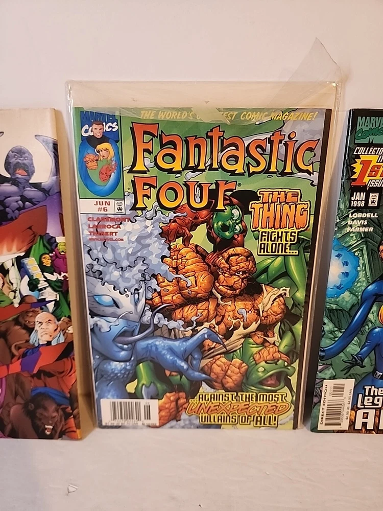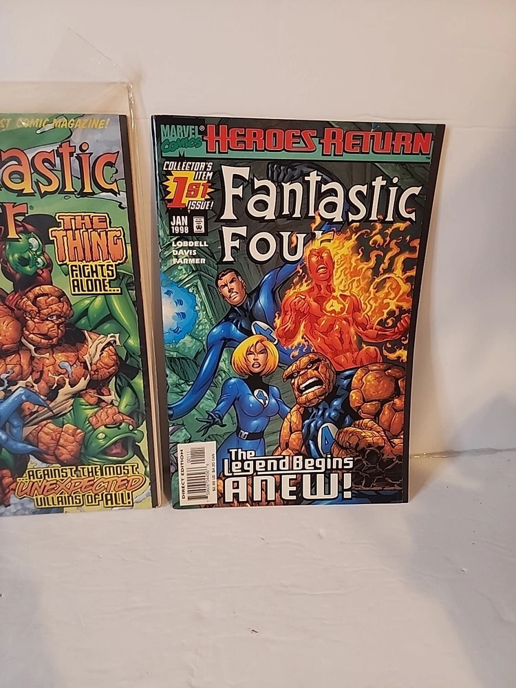 This lot includes three fantastic issues of the Fantastic Four comic book series. The comics feature the adventures of the superhero team, including Human Torch, The Thing, Invisible Woman, Namor, Red Ghost, Silver Surfer, Spider-Man, Mister Fantastic, and Iron Fist. The comics are written by Alan Davis, illustrated by Scott Lobdell, and colored by Salvador Larroca, among other talented artists and writers. The comics are in English, published by Marvel Comics, and are from the Modern Age era (1992-Now). They are boarded and perfect for collectors and fans of the action, superheroes, and adventure genres. The lot does not include signed copies, but it is a great addition to any collection of US Comics, especially for fans of the Fantastic Four team.