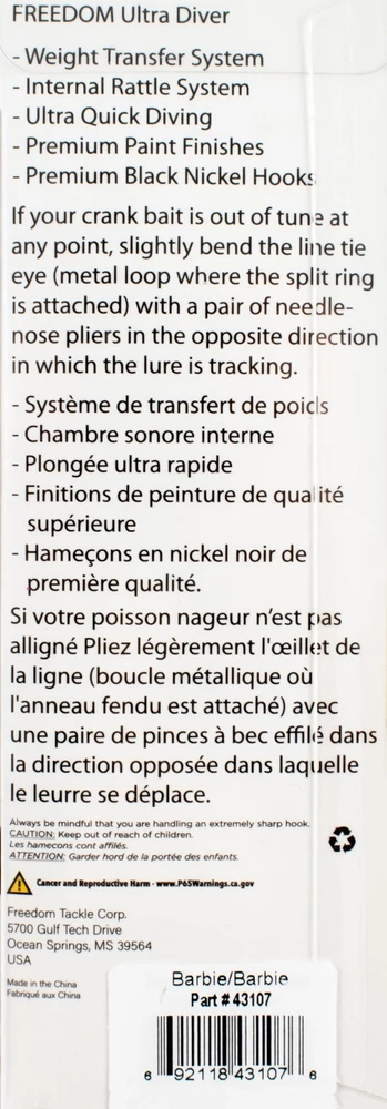 (LOT OF 3) FREEDOM TACKLE ULTRA DIVER SHAD 65 3/8OZ BARBIE #43107 CO6356 (LOT OF 3) FREEDOM TACKLE ULTRA DIVER SHAD 65 3/8OZ BARBIE #43107 CO6356 The FT Ultra Diver Minnow is just the bait you need to up your fishing game. The design team at American Baitworks developed the FT Ultra Diver Minnow with a forward-weighted design which ensures the minnow is primed and ready to dive deep as soon as it hits the water. The cloverleaf bill design also creates a radical deflection action that is sure to attract fish. We placed a lot of emphasis on performance and the realistic 3-piece, sonic-welded body design and integrated one-piece bill design add to the appeal of this bait. Plus, the premium VMC black nickel hooks provide even more durability and strength. You'll be cranking in big ones in no time with the Ultra Diver Minnow. Specs/Features Length: 2 1/2" Weight: 3/8oz Weight transfer system Internal rattle system Ultra quick diving Premium paint finishes Premium black nickel hooks PAYMENT TERMS VISA, MASTERCARD, AMEX, OR DISCOVER PAYPAL APPLE PAY GOOGLE PAY PAYMENTS MUST BE MADE IN FULL WITHIN 7 DAYS SHIPPING TERMS ALL PAID ORDERS SHIP WITHIN 1 BUSINESS DAY INSURANCE IS INCLUDED IN SHIPPING PRICE COMBINED ORDER POLICY ORDERS ARE COMBINED NIGHTLY AFTER END OF ALL AUCTIONS. DO NOT PAY FOR INDIVIDUAL ITEMS ENDING ON THE SAME DATE IF YOU WANT THE ORDER COMBINED. ALLOW US TIME TO SEND YOU A COMBINED INVOICE. ORDERS THAT ARE PAID FOR ON DIFFERENT DATES ARE NOT OUR RESPONSIBILITY TO COMBINE. ITEMS MUST BE PAID IN FULL WITHIN 7 DAYS FROM THE END OF 1ST AUCTION. COMBINED ORDER PRICING BAITS - EACH ADDITIONAL AUCTION $1.00 REELS - EACH ADDITIONAL AUCTION $1.00 RODS* - EACH ADDITIONAL AUCTION $1.00 *ALL RODS WILL ONLY COMBINE WITH RODS OPERATING HOURS BUSINESS HOURS ARE MONDAY - THURSDAY 9AM-5PM CENTRAL TIME & FRIDAY 9AM-3PM CENTRAL TIME, EXCLUDING HOLIDAYS EBAY MESSAGES ARE ANSWERED DURING NORMAL BUSINESS HOURS DUE TO THE OVERWHELMING AMOUNT OF ONLINE ORDERS WE ARE EXPERIENCING, LONGER THAN NORMAL RESPONSE TIME TO EMAILS MAY OCCUR. PLEASE BE PATIENT.
