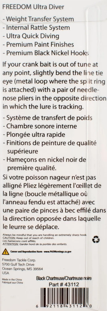(LOT OF 3) FREEDOM TACKLE ULTRA DIVER SHAD 65 3/8OZ BLCK CHRTREUSE #43112 CO6361 (LOT OF 3) FREEDOM TACKLE ULTRA DIVER SHAD 65 3/8OZ BLCK CHRTREUSE #43112 CO6361 The FT Ultra Diver Minnow is just the bait you need to up your fishing game. The design team at American Baitworks developed the FT Ultra Diver Minnow with a forward-weighted design which ensures the minnow is primed and ready to dive deep as soon as it hits the water. The cloverleaf bill design also creates a radical deflection action that is sure to attract fish. We placed a lot of emphasis on performance and the realistic 3-piece, sonic-welded body design and integrated one-piece bill design add to the appeal of this bait. Plus, the premium VMC black nickel hooks provide even more durability and strength. You'll be cranking in big ones in no time with the Ultra Diver Minnow. Specs/Features Length: 2 1/2" Weight: 3/8oz Weight transfer system Internal rattle system Ultra quick diving Premium paint finishes Premium black nickel hooks PAYMENT TERMS VISA, MASTERCARD, AMEX, OR DISCOVER PAYPAL APPLE PAY GOOGLE PAY PAYMENTS MUST BE MADE IN FULL WITHIN 7 DAYS SHIPPING TERMS ALL PAID ORDERS SHIP WITHIN 1 BUSINESS DAY INSURANCE IS INCLUDED IN SHIPPING PRICE COMBINED ORDER POLICY ORDERS ARE COMBINED NIGHTLY AFTER END OF ALL AUCTIONS. DO NOT PAY FOR INDIVIDUAL ITEMS ENDING ON THE SAME DATE IF YOU WANT THE ORDER COMBINED. ALLOW US TIME TO SEND YOU A COMBINED INVOICE. ORDERS THAT ARE PAID FOR ON DIFFERENT DATES ARE NOT OUR RESPONSIBILITY TO COMBINE. ITEMS MUST BE PAID IN FULL WITHIN 7 DAYS FROM THE END OF 1ST AUCTION. COMBINED ORDER PRICING BAITS - EACH ADDITIONAL AUCTION $1.00 REELS - EACH ADDITIONAL AUCTION $1.00 RODS* - EACH ADDITIONAL AUCTION $1.00 *ALL RODS WILL ONLY COMBINE WITH RODS OPERATING HOURS BUSINESS HOURS ARE MONDAY - THURSDAY 9AM-5PM CENTRAL TIME & FRIDAY 9AM-3PM CENTRAL TIME, EXCLUDING HOLIDAYS EBAY MESSAGES ARE ANSWERED DURING NORMAL BUSINESS HOURS DUE TO THE OVERWHELMING AMOUNT OF ONLINE ORDERS WE ARE EXPERIENCING, LONGER THAN NORMAL RESPONSE TIME TO EMAILS MAY OCCUR. PLEASE BE PATIENT.