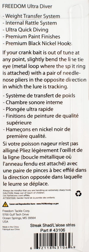 (LOT OF 3) FREEDOM TACKLE ULTRA DIVER SHAD 65 3/8OZ STREAK SHAD #43106 CO6355 (LOT OF 3) FREEDOM TACKLE ULTRA DIVER SHAD 65 3/8OZ STREAK SHAD #43106 CO6355 The FT Ultra Diver Minnow is just the bait you need to up your fishing game. The design team at American Baitworks developed the FT Ultra Diver Minnow with a forward-weighted design which ensures the minnow is primed and ready to dive deep as soon as it hits the water. The cloverleaf bill design also creates a radical deflection action that is sure to attract fish. We placed a lot of emphasis on performance and the realistic 3-piece, sonic-welded body design and integrated one-piece bill design add to the appeal of this bait. Plus, the premium VMC black nickel hooks provide even more durability and strength. You'll be cranking in big ones in no time with the Ultra Diver Minnow. Specs/Features Length: 2 1/2" Weight: 3/8oz Weight transfer system Internal rattle system Ultra quick diving Premium paint finishes Premium black nickel hooks PAYMENT TERMS VISA, MASTERCARD, AMEX, OR DISCOVER PAYPAL APPLE PAY GOOGLE PAY PAYMENTS MUST BE MADE IN FULL WITHIN 7 DAYS SHIPPING TERMS ALL PAID ORDERS SHIP WITHIN 1 BUSINESS DAY INSURANCE IS INCLUDED IN SHIPPING PRICE COMBINED ORDER POLICY ORDERS ARE COMBINED NIGHTLY AFTER END OF ALL AUCTIONS. DO NOT PAY FOR INDIVIDUAL ITEMS ENDING ON THE SAME DATE IF YOU WANT THE ORDER COMBINED. ALLOW US TIME TO SEND YOU A COMBINED INVOICE. ORDERS THAT ARE PAID FOR ON DIFFERENT DATES ARE NOT OUR RESPONSIBILITY TO COMBINE. ITEMS MUST BE PAID IN FULL WITHIN 7 DAYS FROM THE END OF 1ST AUCTION. COMBINED ORDER PRICING BAITS - EACH ADDITIONAL AUCTION $1.00 REELS - EACH ADDITIONAL AUCTION $1.00 RODS* - EACH ADDITIONAL AUCTION $1.00 *ALL RODS WILL ONLY COMBINE WITH RODS OPERATING HOURS BUSINESS HOURS ARE MONDAY - THURSDAY 9AM-5PM CENTRAL TIME & FRIDAY 9AM-3PM CENTRAL TIME, EXCLUDING HOLIDAYS EBAY MESSAGES ARE ANSWERED DURING NORMAL BUSINESS HOURS DUE TO THE OVERWHELMING AMOUNT OF ONLINE ORDERS WE ARE EXPERIENCING, LONGER THAN NORMAL RESPONSE TIME TO EMAILS MAY OCCUR. PLEASE BE PATIENT.