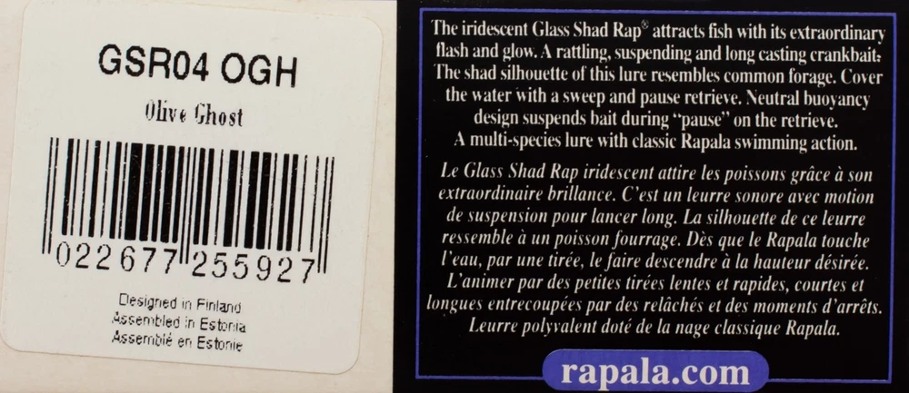 (LOT OF 3) RAPALA GLASS SHAD RAP 3/16OZ GSR04 OGH OLIVE GHOST CP2344 (LOT OF 3) RAPALA GLASS SHAD RAP 3/16OZ GSR04 OGH OLIVE GHOST CP2344 Molded high-impact plastic with holographic foil insert allows the chameleon-like Glass Shad Rap® to pick up the color of its surroundings and bounce the same color back in an iridescent glow. When fished in bright sunlight or low light, the lure looks completely natural, adapting to the current conditions. Suspending on pause, the long-casting Glass Shad Rap® swims with a slightly different action than the legendary balsa model. Add internal rattle, VMC® black nickel hooks and hand-tuned and tank-tested features, this lure truly has it all. Features See-Thru Glass Body Rattlin' & Suspending Long-Casting Unique Wobble Holographic Eye VMC® Black Nickel Treble Hooks Hand Tuned & Tank Tested Specs Weight: 3/16oz Length: 1-1/2" Depth: 5'-11' PAYMENT TERMS VISA, MASTERCARD, AMEX, OR DISCOVER PAYPAL APPLE PAY GOOGLE PAY PAYMENTS MUST BE MADE IN FULL WITHIN 7 DAYS SHIPPING TERMS ALL PAID ORDERS SHIP WITHIN 1 BUSINESS DAY INSURANCE IS INCLUDED IN SHIPPING PRICE COMBINED ORDER POLICY ORDERS ARE COMBINED NIGHTLY AFTER END OF ALL AUCTIONS. DO NOT PAY FOR INDIVIDUAL ITEMS ENDING ON THE SAME DATE IF YOU WANT THE ORDER COMBINED. ALLOW US TIME TO SEND YOU A COMBINED INVOICE. ORDERS THAT ARE PAID FOR ON DIFFERENT DATES ARE NOT OUR RESPONSIBILITY TO COMBINE. ITEMS MUST BE PAID IN FULL WITHIN 7 DAYS FROM THE END OF 1ST AUCTION. COMBINED ORDER PRICING BAITS - EACH ADDITIONAL AUCTION $1.00 REELS - EACH ADDITIONAL AUCTION $1.00 RODS* - EACH ADDITIONAL AUCTION $1.00 *ALL RODS WILL ONLY COMBINE WITH RODS OPERATING HOURS BUSINESS HOURS ARE MONDAY - THURSDAY 9AM-5PM CENTRAL TIME & FRIDAY 9AM-3PM CENTRAL TIME, EXCLUDING HOLIDAYS EBAY MESSAGES ARE ANSWERED DURING NORMAL BUSINESS HOURS DUE TO THE OVERWHELMING AMOUNT OF ONLINE ORDERS WE ARE EXPERIENCING, LONGER THAN NORMAL RESPONSE TIME TO EMAILS MAY OCCUR. PLEASE BE PATIENT.