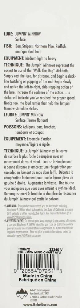 (LOT OF 3) REBEL JUMPIN MINNOW 1/2OZ T20572 CHARTREUSE AYU D7308 (LOT OF 3) REBEL JUMPIN MINNOW 1/2OZ T20572 CHARTREUSE AYU D7308 Nothing triggers bass and inshore predator fish like the subtle walk-the-dog action of a Rebel Jumpin’ Minnow. This slender minnow-shaped topwater bait sashays back-and-forth on the surface to create a hypnotizing action like that of a fleeing baitfish. Internal weighting allows for long casts with this slender bait, making it perfect for schooling fish and anytime fish are feeding on top. Length: 4-1/2" Weight: 1/2oz Hook: #2 Treble Depth: Topwater PAYMENT TERMS VISA, MASTERCARD, AMEX, OR DISCOVER PAYPAL APPLE PAY GOOGLE PAY PAYMENTS MUST BE MADE IN FULL WITHIN 7 DAYS SHIPPING TERMS ALL PAID ORDERS SHIP WITHIN 1 BUSINESS DAY INSURANCE IS INCLUDED IN SHIPPING PRICE COMBINED ORDER POLICY ORDERS ARE COMBINED NIGHTLY AFTER END OF ALL AUCTIONS. DO NOT PAY FOR INDIVIDUAL ITEMS ENDING ON THE SAME DATE IF YOU WANT THE ORDER COMBINED. ALLOW US TIME TO SEND YOU A COMBINED INVOICE. ORDERS THAT ARE PAID FOR ON DIFFERENT DATES ARE NOT OUR RESPONSIBILITY TO COMBINE. ITEMS MUST BE PAID IN FULL WITHIN 7 DAYS FROM THE END OF 1ST AUCTION. COMBINED ORDER PRICING BAITS - EACH ADDITIONAL AUCTION $1.00 REELS - EACH ADDITIONAL AUCTION $1.00 RODS* - EACH ADDITIONAL AUCTION $1.00 *ALL RODS WILL ONLY COMBINE WITH RODS OPERATING HOURS BUSINESS HOURS ARE MONDAY - THURSDAY 9AM-5PM CENTRAL TIME & FRIDAY 9AM-3PM CENTRAL TIME, EXCLUDING HOLIDAYS EBAY MESSAGES ARE ANSWERED DURING NORMAL BUSINESS HOURS DUE TO THE OVERWHELMING AMOUNT OF ONLINE ORDERS WE ARE EXPERIENCING, LONGER THAN NORMAL RESPONSE TIME TO EMAILS MAY OCCUR. PLEASE BE PATIENT.
