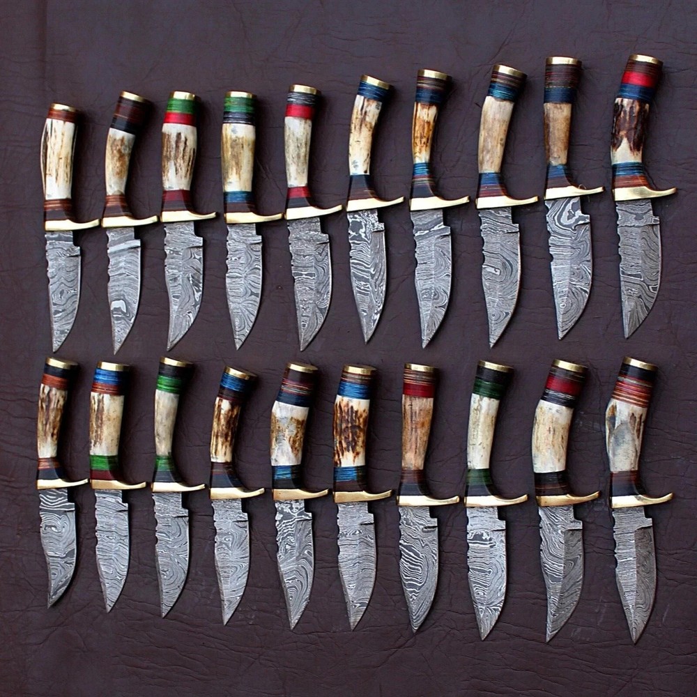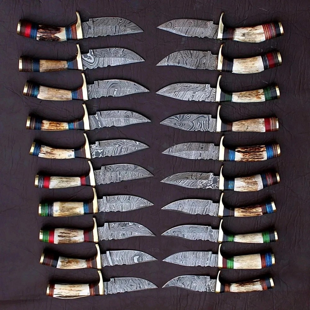 MARVELLOUS LOT OF "50" CUSTOM HANDMADE FORGED DAMASCUS STEEL TWISTED PATTER SHARPENED EDGE FULL TANG BLADE EDC CAMPING HUNTING CAMPING SKINNER KNIVES IN STAG HORN & BRASS HAND GUARD HANDLE. MEASUREMENT: OVERALL LENGHT: 6.00 INCHES (APPROX.) BLADE LENGTH: 3.00 INCHES (APPROX.) HANDLE LENGHT: 3.00 INCHES (APPROX.) FEATURES: Sharp Edge Easy to Carry Smooth Grip And Long Lasting Useable Knife For Hunting and Outdoors Man. HAND FORGED DAMASCUS BLADES: Damascus blades are hand forged through a process of layering, melting and hammering. This results in each blade having a unique design or as some would say a "fingerprint". Each & every knife is truly one of a kind. Damascus steel has outstanding properties of strength and hardness. We amplify its properties by oil quenching it at 2100 deg F to cool it down fast and we do it twice to make sure it's hard to its inner core to withstand any kind of work you may put it to use. It achieves a 58 or higher HRC on the Rockwell Scale. Producing Damascus steel is still unknown to this day, the process has been lost over the past 500 years. Today, we layer & hand forge two different steels 15n20 & 1095. It is then dipped in Ferric Chloride creating a distinct reaction with the metals producing a Damascus like pattern. ✅ 【 PATENTED DESIGN】 Manufactured with ultra-sharp hand forged Damascus steel cutting core at HRC58-60 hardness, this knife comes with unrivaled performance and incredible edge retention. ✅【 HIGH QUALITY HANDMADE KNIFE WITH SHARP, STRONG, AND DURABLE BLADE 】 This knife was hand crafted with the highest attention to detail to create this unique sharp blade with a sturdy handle. This knife is made of high-quality Damascus steel and will not rust with proper care. ✅ 【 PERFECT OUTDOOR CAMPING KNIFE AND HUNTING KNIFE 】 This knife is the perfect camp knife and hunting knife. It’s the best knife for any hunter, camper, survivalist, or outdoor sports enthusiast so that you can enjoy your adventure. ✅ 【 EXCELLENT HANDMADE BUSH CRAFT KNIFE 】 The Perfect bush craft, camp survival knife for all of your most rugged adventures out in the wild. This survival knife will give you an edge so that you can win in the competition against the wild outdoors. ✅ 【 DECORATIVE EDC HUNTING KNIFE FOR COLLECTORS 】 Enrich your collection with this beautifully forged handmade Damascus knife that is sure to impress with its hand forged layers of premium steel and handle. It’s the perfect addition for any true knife collector. ✅ 【 COMFORTABLE AND ERGONOMIC DESIGN FOR EASY GRIP 】 The unique handle is handcrafted for maximum comfort making it the perfect knife for all of your outdoor needs. Full hollow blade is light weight and compliments the handle in maintaining balance and help to reduce stress on your hands after use with comfort while providing you with the perfect blend of performance and comfort. ✅ 【 ULTIMATELY DURABLE HANDLE 】 The meticulously constructed handle has gone through special treatment, making it extremely impervious to heat, moisture, cold with military grade strength and life-long sturdiness; multiple times riveted for extra resilience, ✅ 【 SUPERIOR SHARPNESS 】 Ruthlessly shaving sharp edge is handcrafted by me to a mirror polish at 15-25° per side using the traditional 3-step honing method. ✅ 【 WARRANTY 】 No premium knife is complete without a lifetime warranty; our masterpiece knife is fully covered for life, free exchange or return for life if the item is defective. ✅ 【 SUPERIOR SHARPNESS 】 Ruthlessly shaving sharp edge is handcrafted by me to a mirror polish at 15-25° per side using the traditional 3-step honing method. ✅ 【 WARRANTY 】 No premium knife is complete without a lifetime warranty; our masterpiece knife is fully covered for life, free exchange or return for life if the item is defective. This knife looks great in the sheath or on a belt making it easy to retrieve. It has the perfect sharpness to make your everyday utilitarian tasks an enjoyable experience. Perfect for hunting, fishing, hiking, camping, boating, backpacking, or any other outdoor adventure. It is also a key item to add to your survival tactical gear!