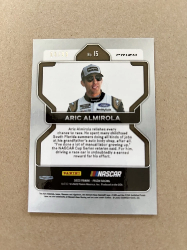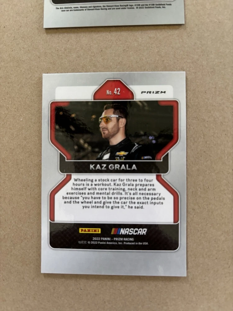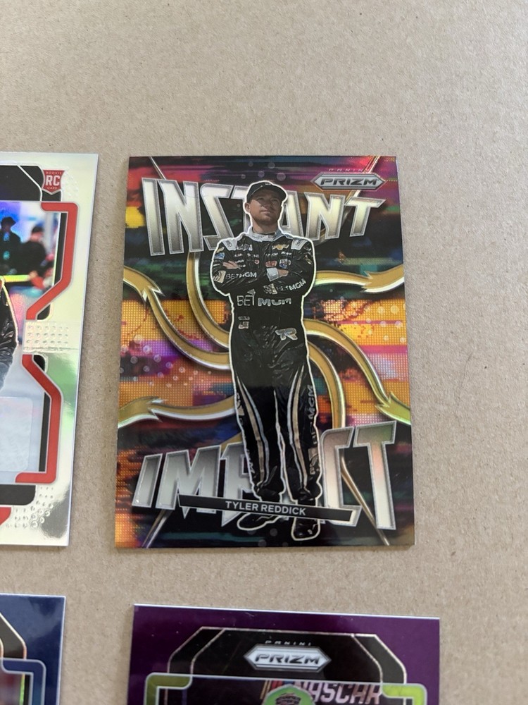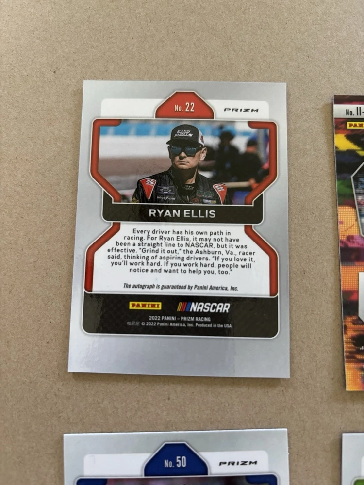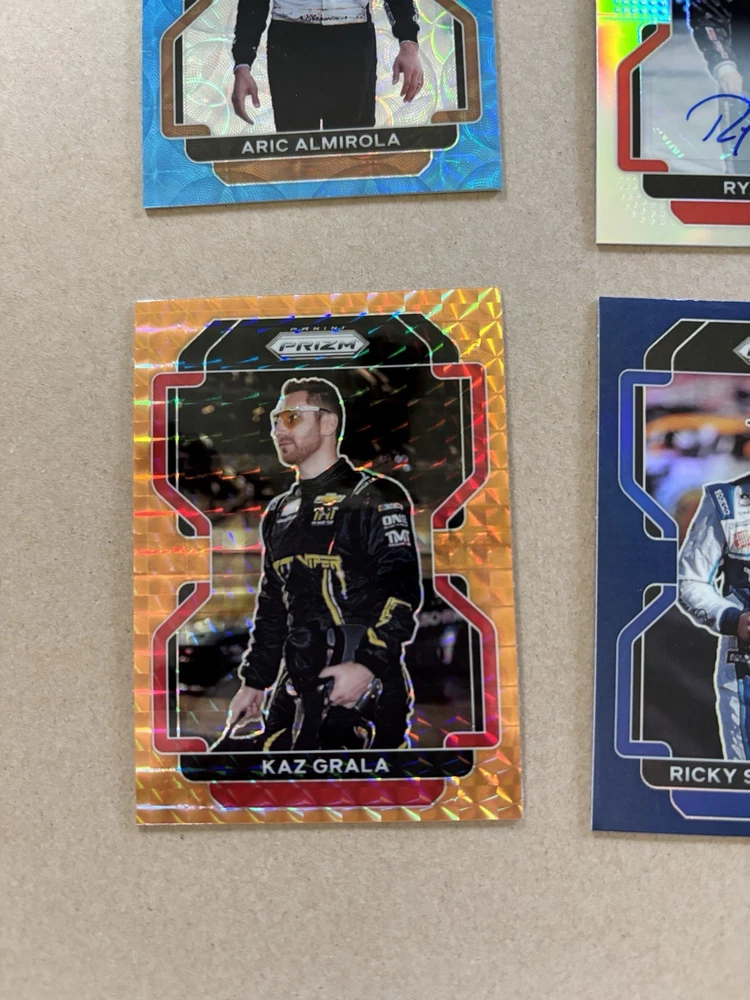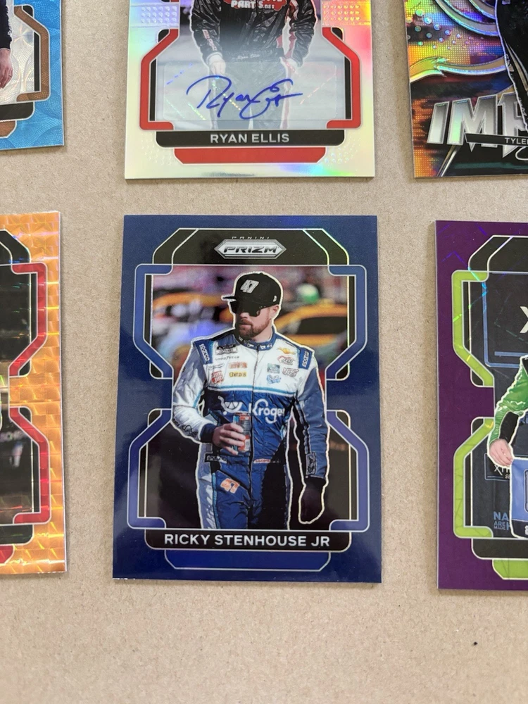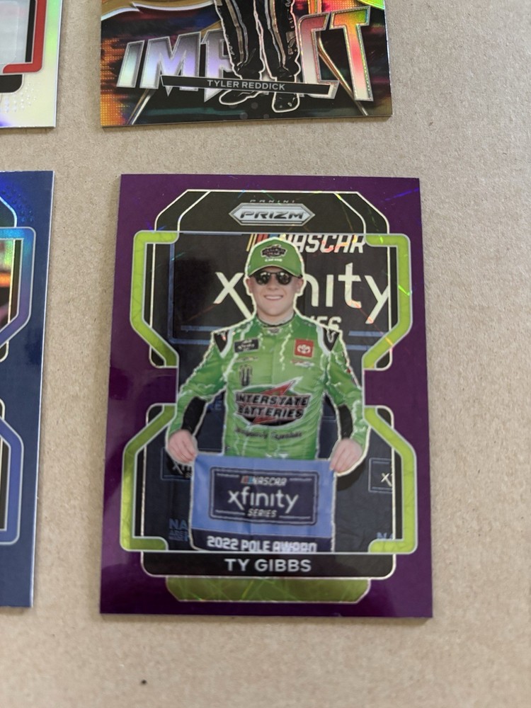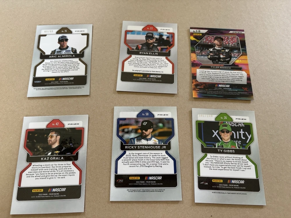 Ryan Ellis Silver Prizm Autograph Ty Gibbs Purple Scope Prizm /199 Ricky Stenhouse Blue Scope Prizm Kaz Grala Orange Reactive Prizm Tyler Reddick Instant Impact Silver Prizm Aric Almirola Blue Prizm /99 This lot includes six autographed sports trading cards from the 2022 Panini Prizm set, featuring the up-and-coming NASCAR driver Ty Gibbs. These cards are all short prints, making them a rare addition to any collection. Each card showcases Gibbs in action, capturing the excitement of auto racing. These cards are perfect for any fan of NASCAR or trading card collector. The autographs add an extra level of uniqueness and value to each card. Don't miss out on the opportunity to own a piece of racing history.
