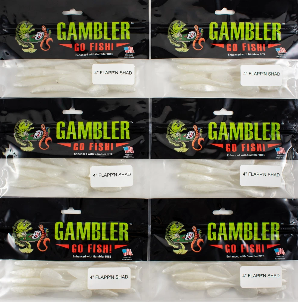 (LOT OF 6) GAMBLER LURES 4" FLAPP'N SHAD WHITE LIGHTNING BM3419