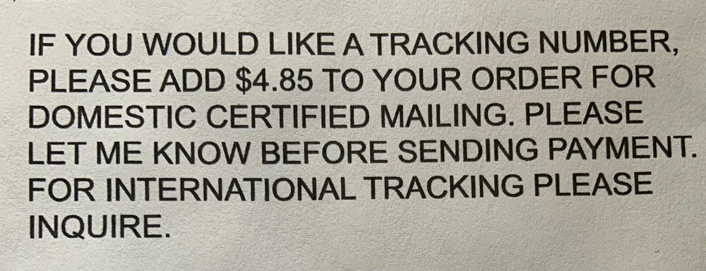 DOMESTIC... FREE BASIC SHIPPING, CERTIFIED SHIPMENT WITH TRACKING $4.85 EXTRA INTERNATIONAL...$3.00 BASIC SHIPPING, REGISTERED SHIPPING WITH TRACKING $21.00 EXTRA Any note selling for more than $50.00 will automatically have tracking surcharge added.