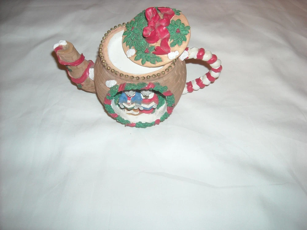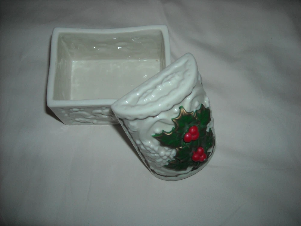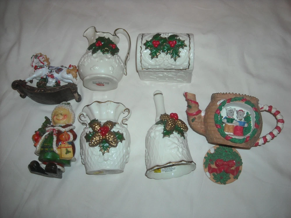 Lot of 7 varied Christmas decorations. White porcelain decorations include: 4" x 3 1/2" trinket box, 6" bell, 4 1/4" vase, and 4 1/4" pitcher. Acrylic carousel horse is 3 1/2" x 4 1/2". Acrylic teapot candleholder is 3 1/2" x 3 1/2". Acrylic figurine is 5" tall.