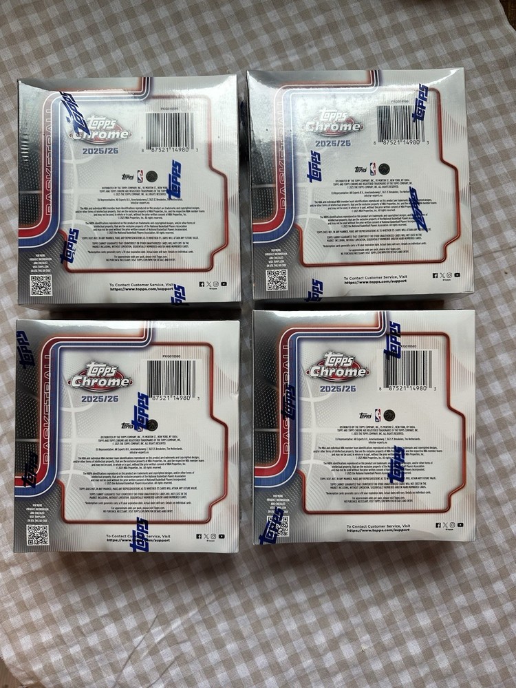 The 2025-2026 Topps Chrome Basketball Mega Box features standard-sized trading cards of NBA players, focusing on the 2025-26 Chrome set. This sealed box includes four counts of cards, with one autographed card of Stephen Curry, signed in hard format and authenticated by Topps. The cards are made of card stock and include exclusive, rookie, and insert features. With a focus on the Golden State Warriors and the NBA Finals, this collection is a must-have for basketball card enthusiasts looking for unique and valuable additions to their collection. Coms wit FOUR SEALED MEGAS AS SEEN