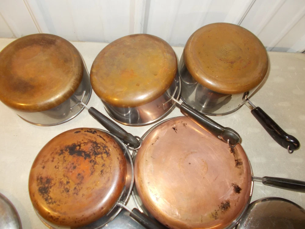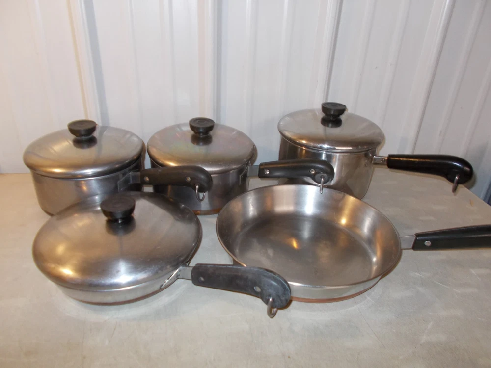 7--LOT OF VINTAGE REVERE WARE PANS, 10" SKILLET NO LID, 8" SKILLET, 3 QT SAUCEPAN AND I CAN'T MAKE OUT THE SIZE OF THE OTHER 2 BUT LOOK LIKE 2 QT SIZE and THEY ARE THE SAME SIZE
