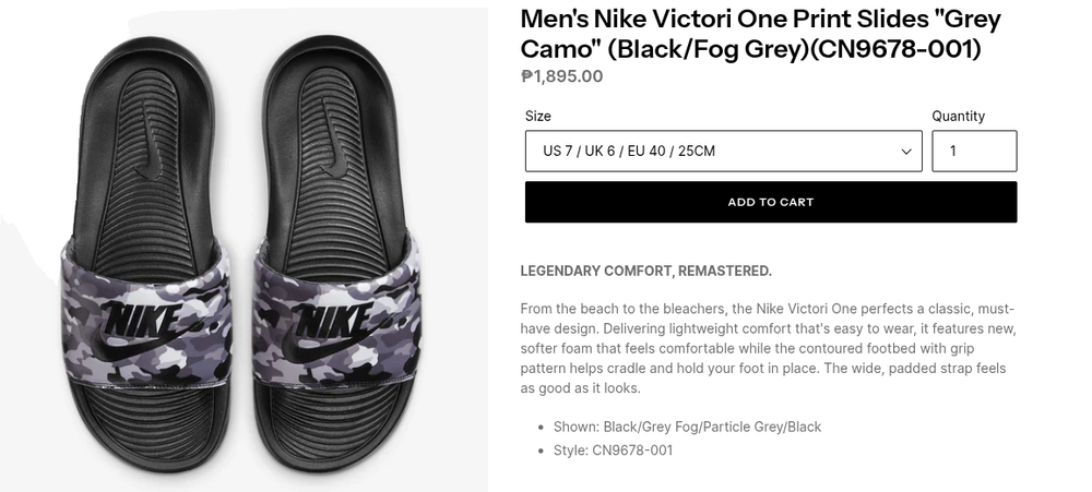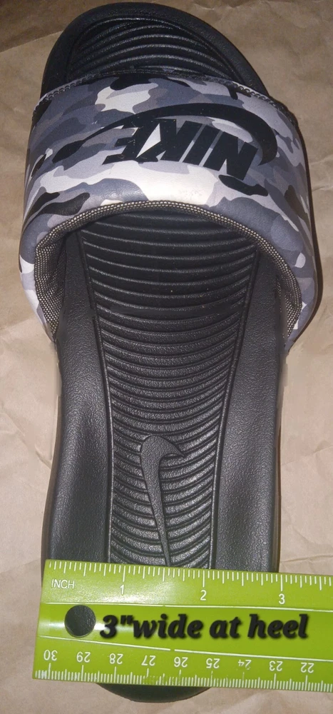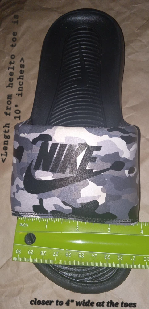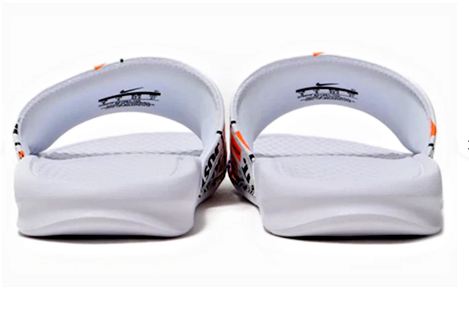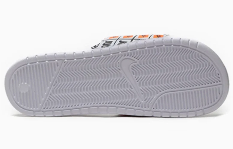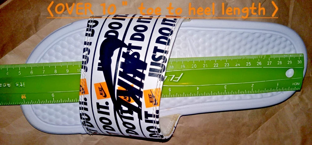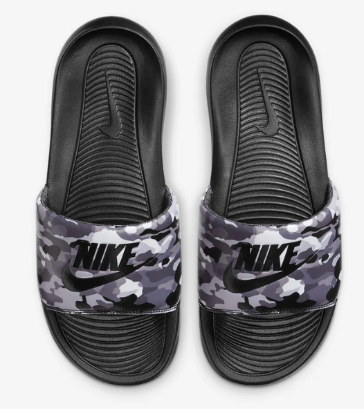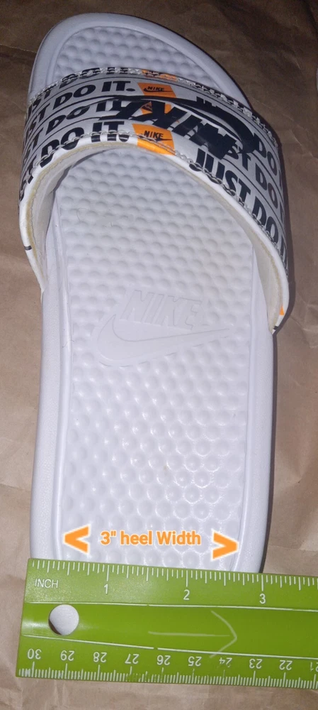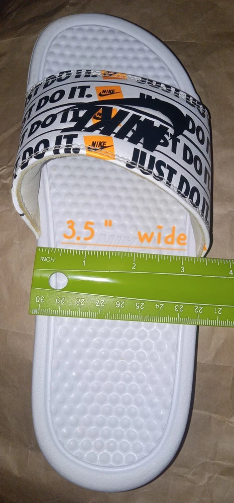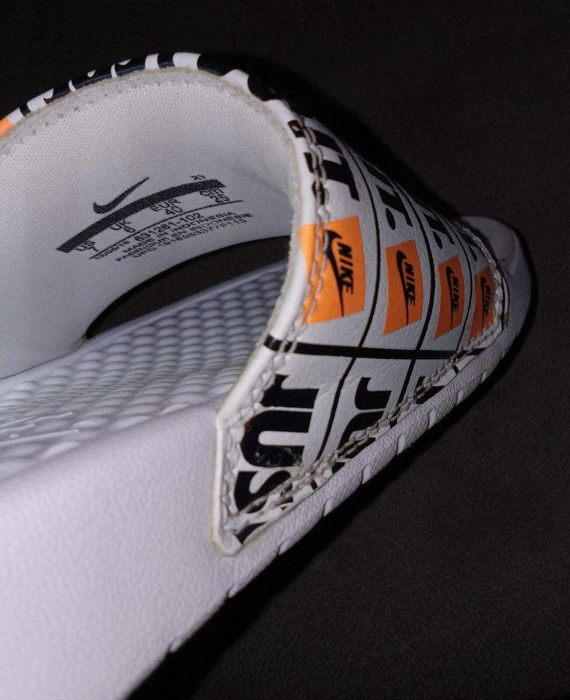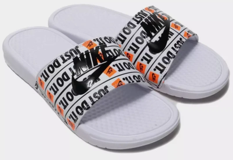 END of Summer DISCOUNT! Lot of two pairs of authentic, classic NIKE Slides. Both pairs in NEW condition and are US size 7 mens . 1ST Pair : NIKE Victori One Camo Print CN9678-01, Black slides, classic camouflaged strap, with "NIKE" and signature Swoosh across the top. AND 2ND Pair: the NIKE Benassi JDI Print 631261-102 , the White slides, white strap with multiple"JUST DO IT"across entire strap, with "NIKE" Swoosh on top of that, all black text over white, then the aligned rows of small orange NIKE swoosh squares gives the perfect color pop that completes this eye catching design.