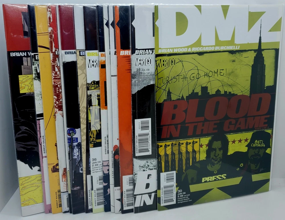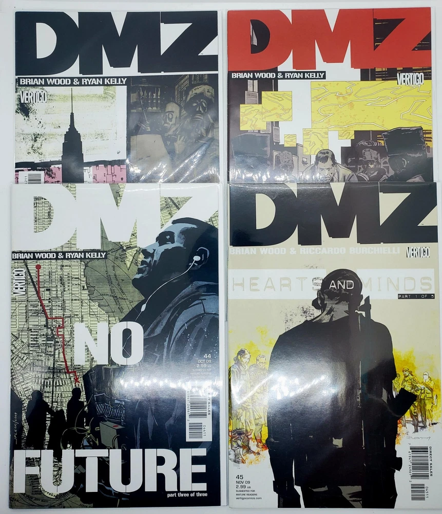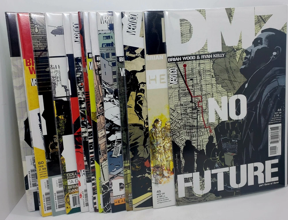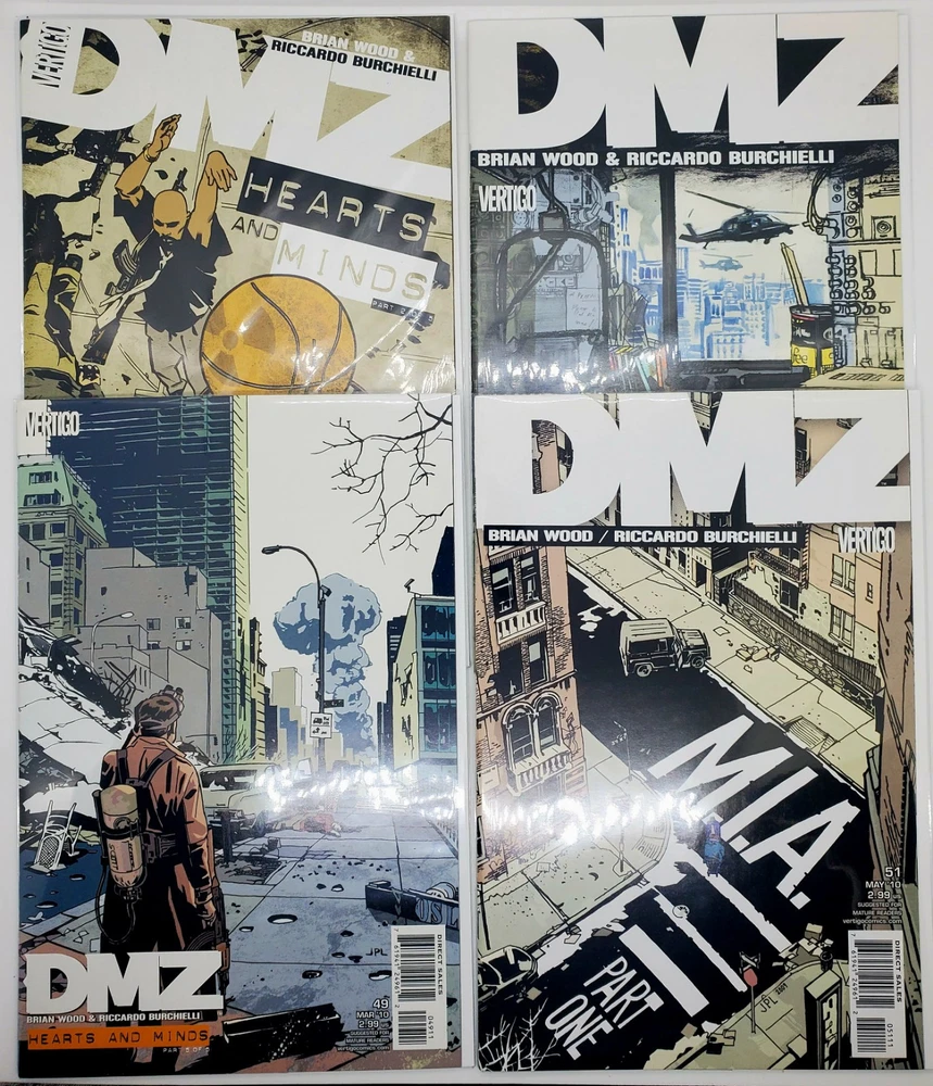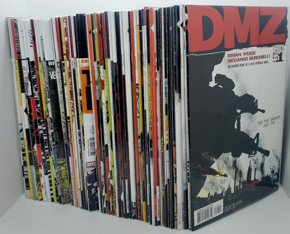LOT of 56 DMZ Comic Books #1-61 (Vertigo, 2006) 1st Print! Mint Condition! π₯π *Issues not included are #23, 47, 50, 52, 56 #1 through #61 for a total of 56 Issues included are: #1, 2, 3, 4, 5, 6, 7, 8, 9, 10, 11, 12, 13, 14, 15, 16, 17, 18, 19, 20, 21, 22, 24, 25, 26, 27, 28, 29, 30, 31, 32, 33, 34, 35, 36, 37, 38, 39, 40, 41, 42, 43, 44, 45, 46, 48, 49, 51, 53, 54, 55, 57, 58, 59, 60, 61 *All issues are in Excllent Condition! π *All issues are inside an acid free clear plastic protector sleeve alongside a white comic book cardboard sleeve. This lot includes 56 comic books of the "DMZ" series, published by Vertigo Comics in 2006. The set consists of issues #1-61, featuring cover variant A by artist Brian Wood and written by Brian Wood and Riccardo Burchielli. Set in the Vertigo Universe, the comics fall under the Action and Science Fiction genres and are intended for mature audiences, as per the Viewer Discretion Advised warning. The collection offers a comprehensive look into the storyline of DMZ, a popular series in US comics.