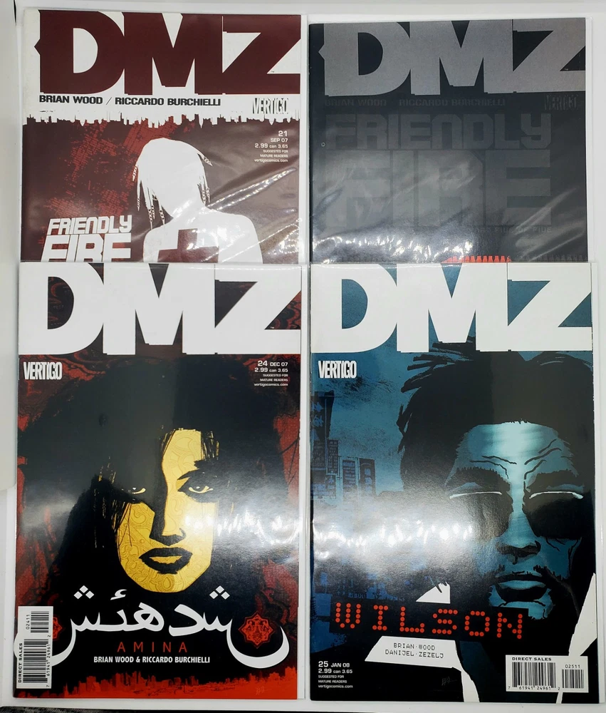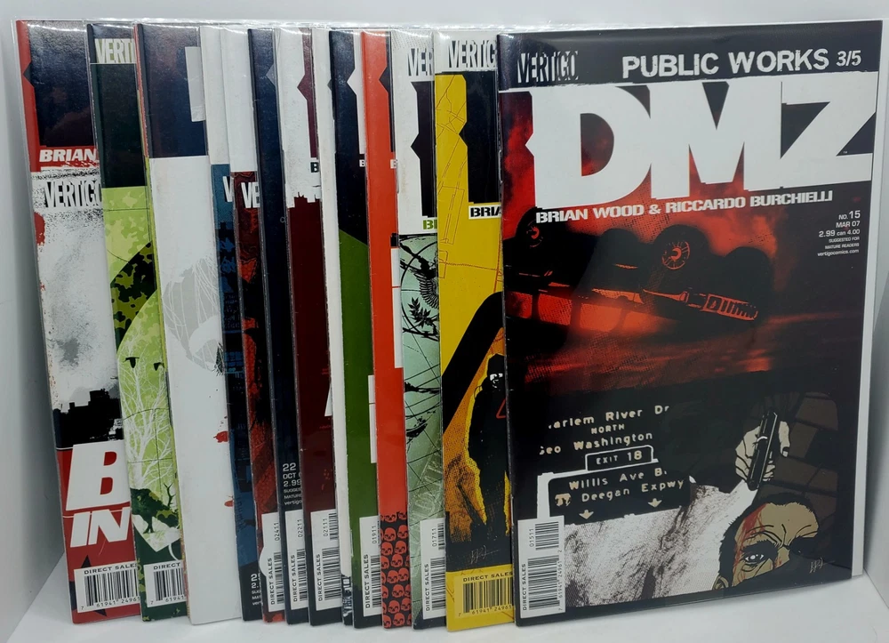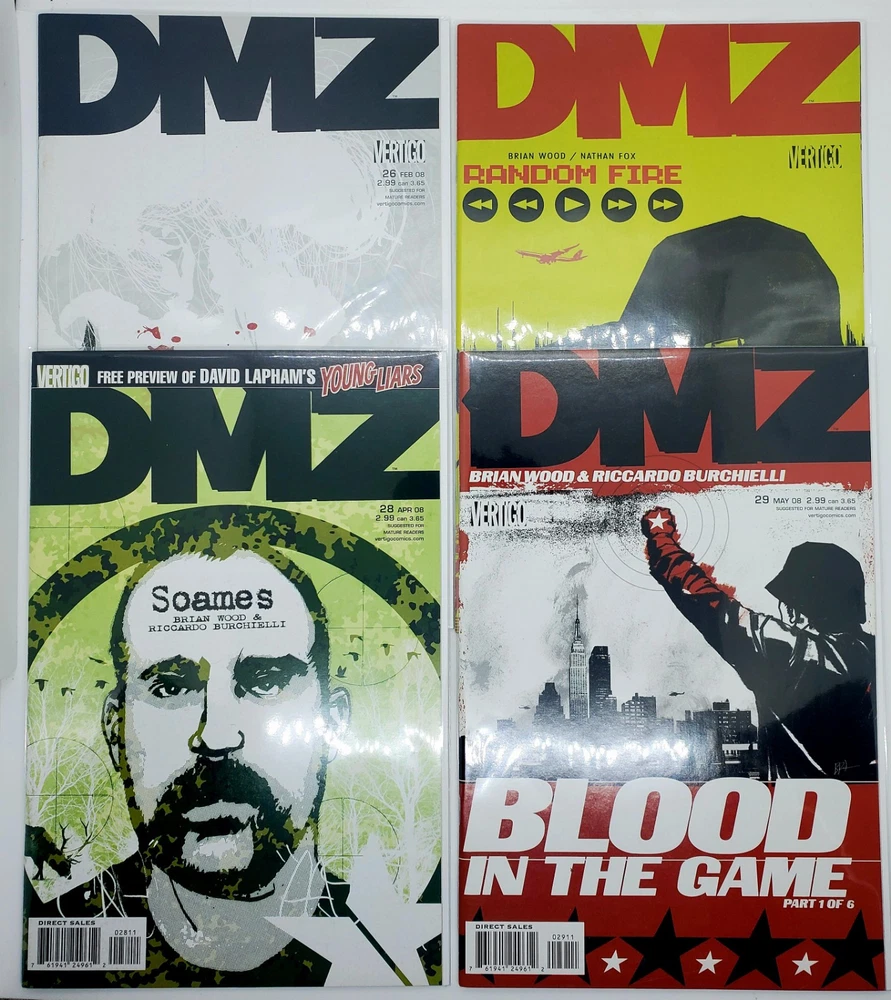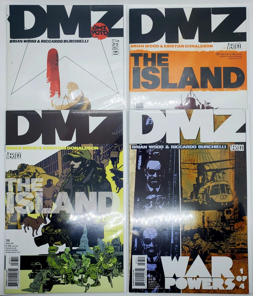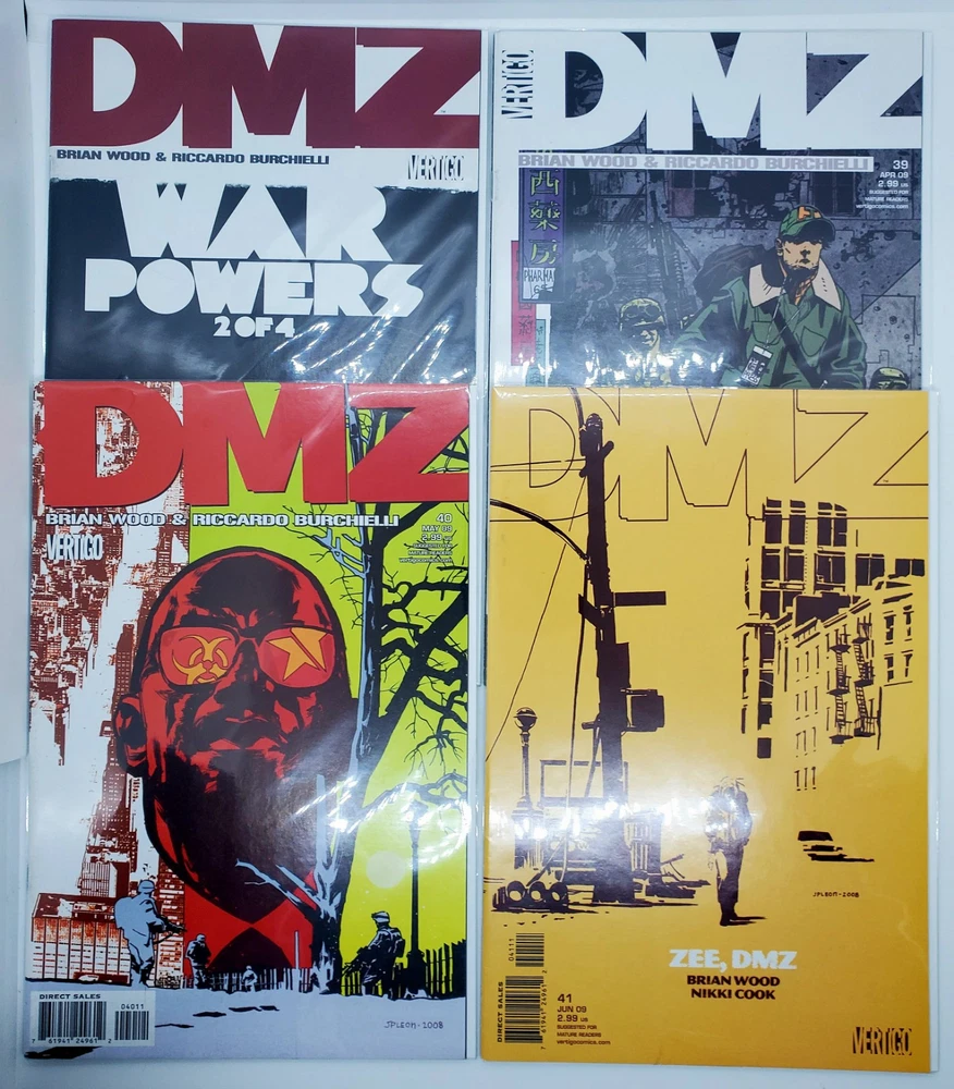 LOT of 56 DMZ Comic Books #1-61 (Vertigo, 2006) 1st Print! Mint Condition! π₯π *Issues not included are #23, 47, 50, 52, 56 #1 through #61 for a total of 56 Issues included are: #1, 2, 3, 4, 5, 6, 7, 8, 9, 10, 11, 12, 13, 14, 15, 16, 17, 18, 19, 20, 21, 22, 24, 25, 26, 27, 28, 29, 30, 31, 32, 33, 34, 35, 36, 37, 38, 39, 40, 41, 42, 43, 44, 45, 46, 48, 49, 51, 53, 54, 55, 57, 58, 59, 60, 61 *All issues are in Excllent Condition! π *All issues are inside an acid free clear plastic protector sleeve alongside a white comic book cardboard sleeve. This lot includes 56 comic books of the "DMZ" series, published by Vertigo Comics in 2006. The set consists of issues #1-61, featuring cover variant A by artist Brian Wood and written by Brian Wood and Riccardo Burchielli. Set in the Vertigo Universe, the comics fall under the Action and Science Fiction genres and are intended for mature audiences, as per the Viewer Discretion Advised warning. The collection offers a comprehensive look into the storyline of DMZ, a popular series in US comics.