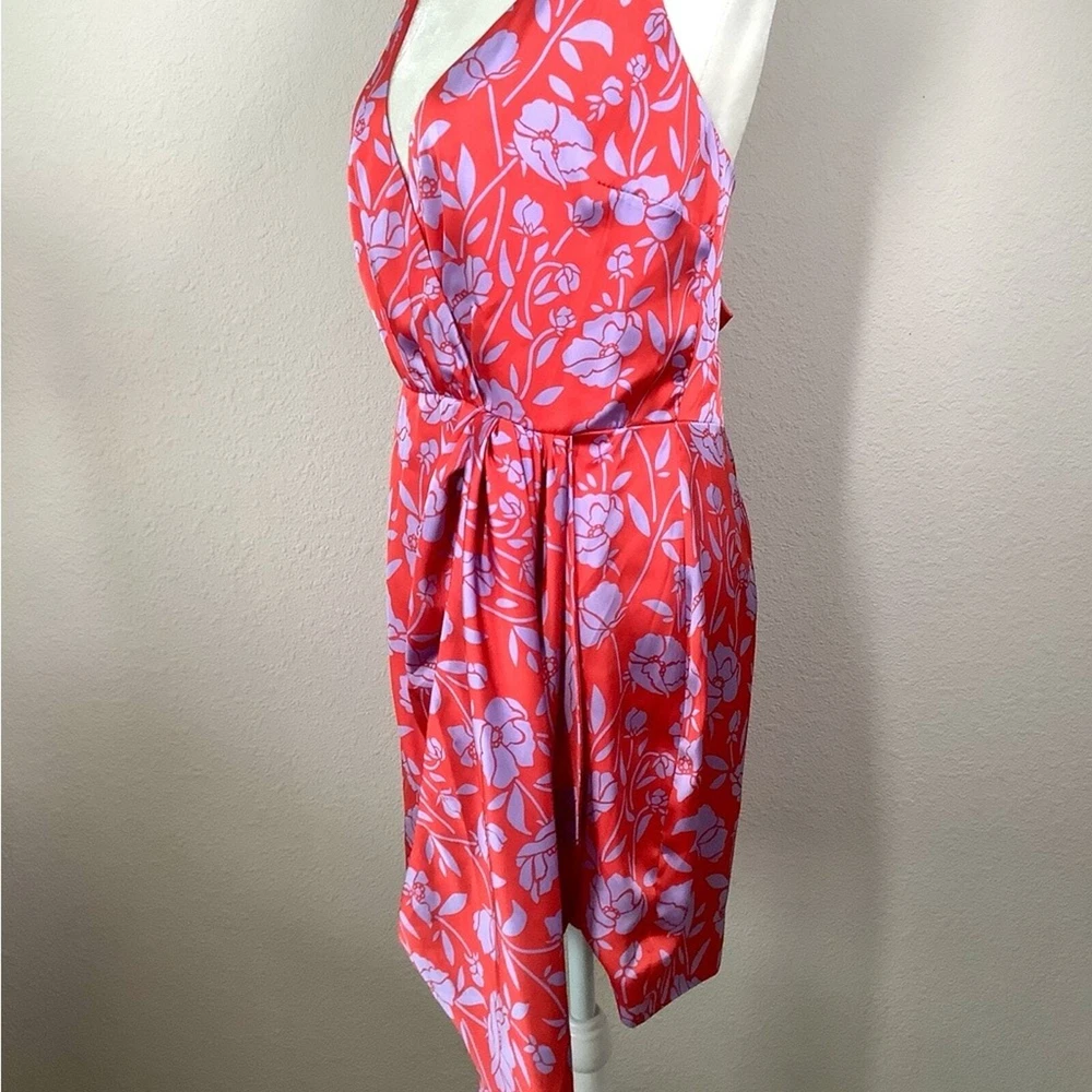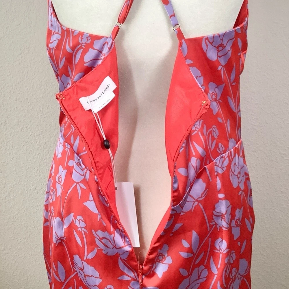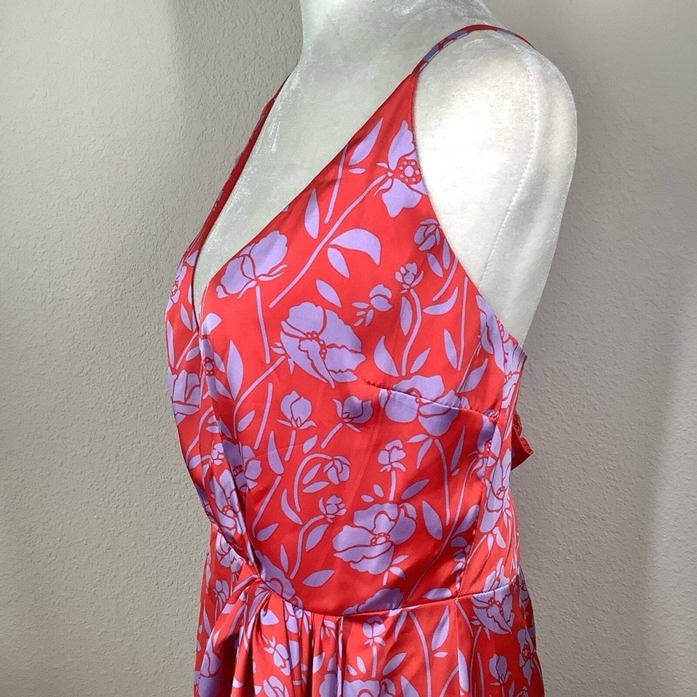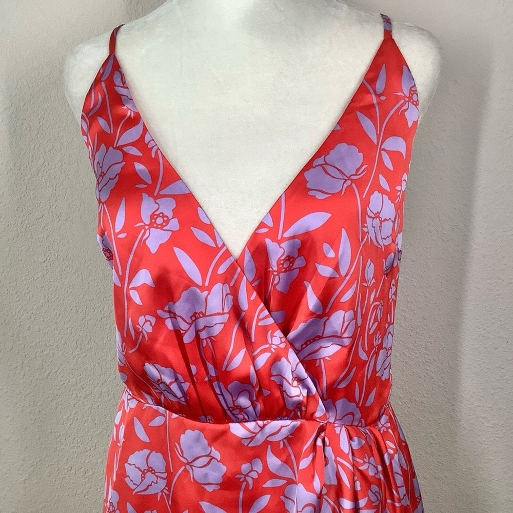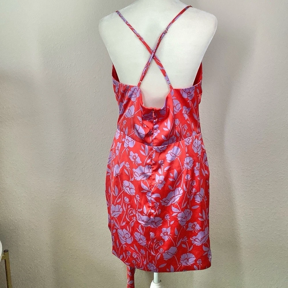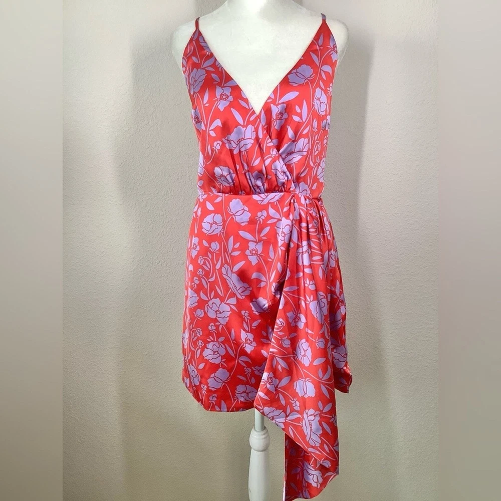 LOVERS & FRIENDS x Revolve Kamala Floral Satin Mini Dress Size: Large | L 100% poly - silky, satin - non-stretch Hand wash cold Fully lined Satin fabric with draped accent Tulip hem Adjustable shoulder straps Hidden back zipper closure Red & purple Style No. LOVF-WD2072 NEW with tag Flat Lay Measurements: Pit to Pit: 18" Waist: 15" Length: 33" Smoke & Pet Free sexy, clubbing, dancing, vacation, girls trip, homecoming, cruise, resort, beach wedding, wedding guest, date night, cocktail party, party, event