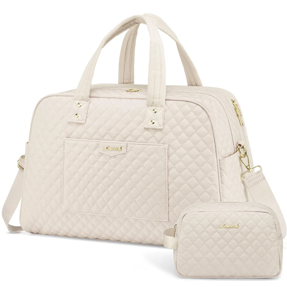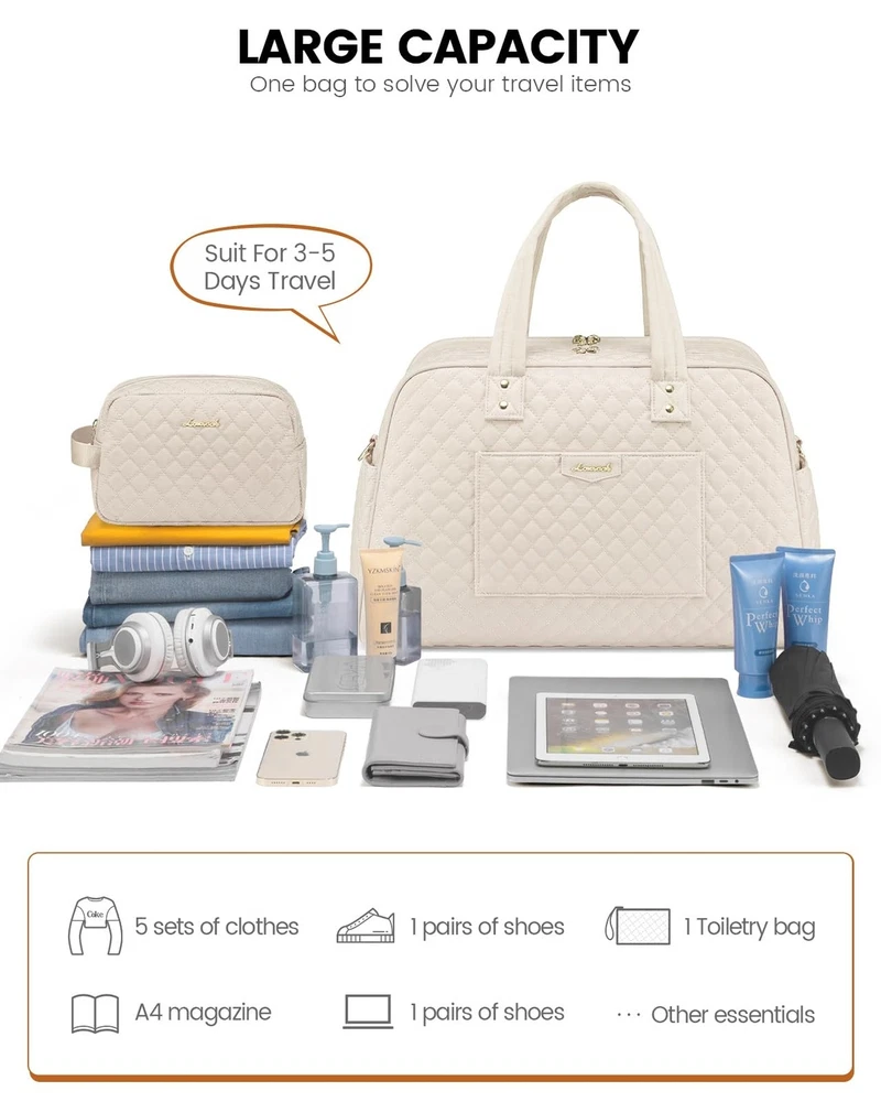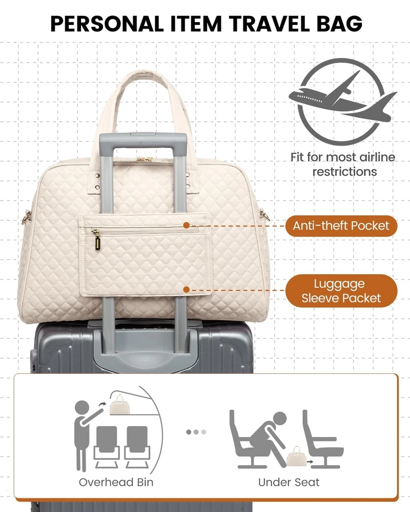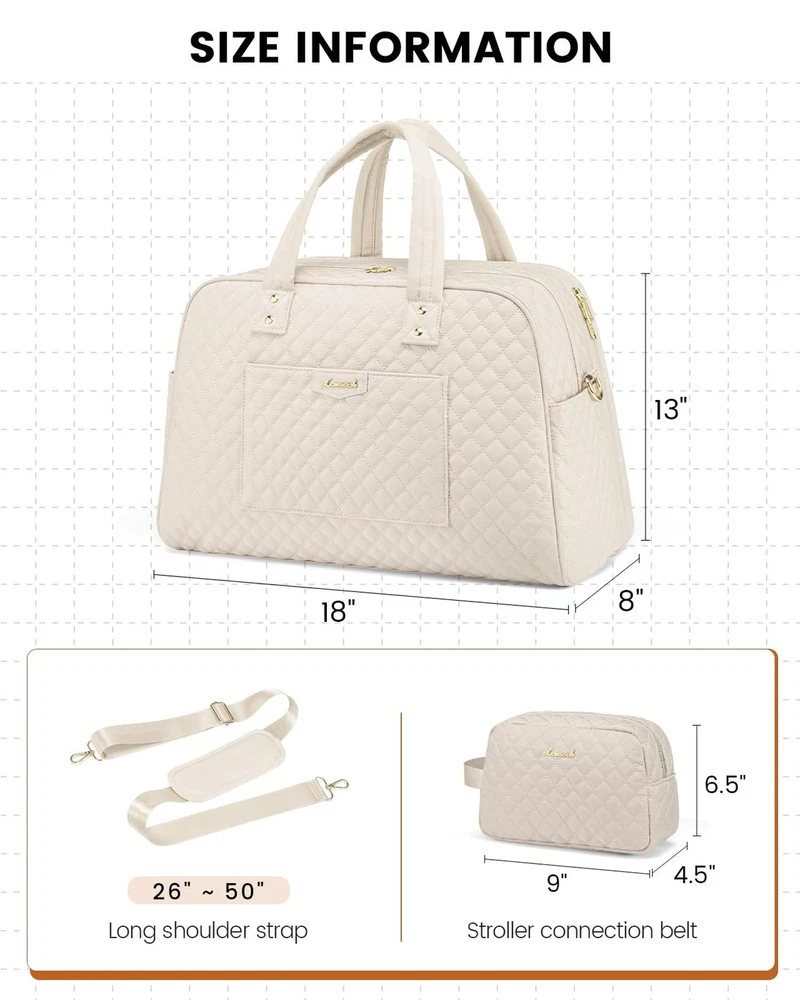 LOVEVOOK Travel Duffle Bag, Weekender Overnight Bag with Laptop Compartment for Women, Large Carry On Bag with Wet Pocket and toiletry Bag for Travel, Hospital, Business Trips, Sports, Beige Product Details Color: Beige Size: Large Brand: LOVEVOOK MPN: Does not apply UPC: Does not apply EAN: Does not apply Product Dimensions: 18 x 8 x 13 inches Item Weight: 2.25 pounds Department: Unisex Adult Manufacturer: LOVEVOOK Country of Origin: China Number of Compartments: 12 Large Capacity Designed to accommodate 3-5 days' worth of travel essentials. The carry on bag features a dedicated 15.6" laptop compartment for comprehensive protection of your electronics, while the main compartment offers ample space for clothing, toiletries, and shoes. Personal Item Travel BagMeasuring 18x13x8 inches, this design meets the personal item specifications of most major airlines such as Frontier, Spirit, and American Airlines. It fits comfortably under the seat, saving you from expensive checked baggage fees. Travel-Friendly Features Equipped with a separate toiletry bag, a wet-dry separation pouch, a convenient front quick-access pocket, and an integrated luggage sleeve, navigating airports has never been easier. Durable and Soft Material Made from a newly developed, soft fabric, this bag is ideally suited for use as a duffle bags, travel bags for women, duffle bag women, duffle bag for travel, carry on duffle bag or business laptop bag. Multifunctional Attributes Comes with a detachable shoulder strap, a luggage handle strap, and anti-theft zippers. Moreover, it serves as an ideal gift for family, friends, and partners.