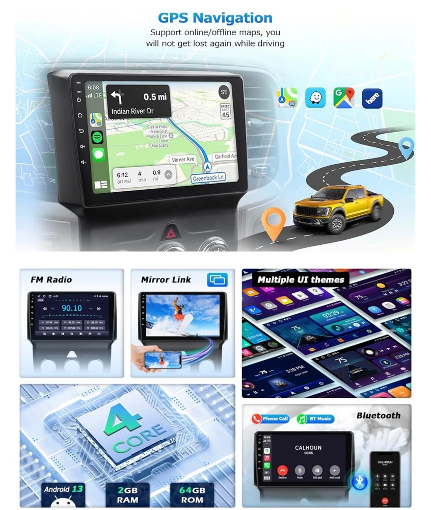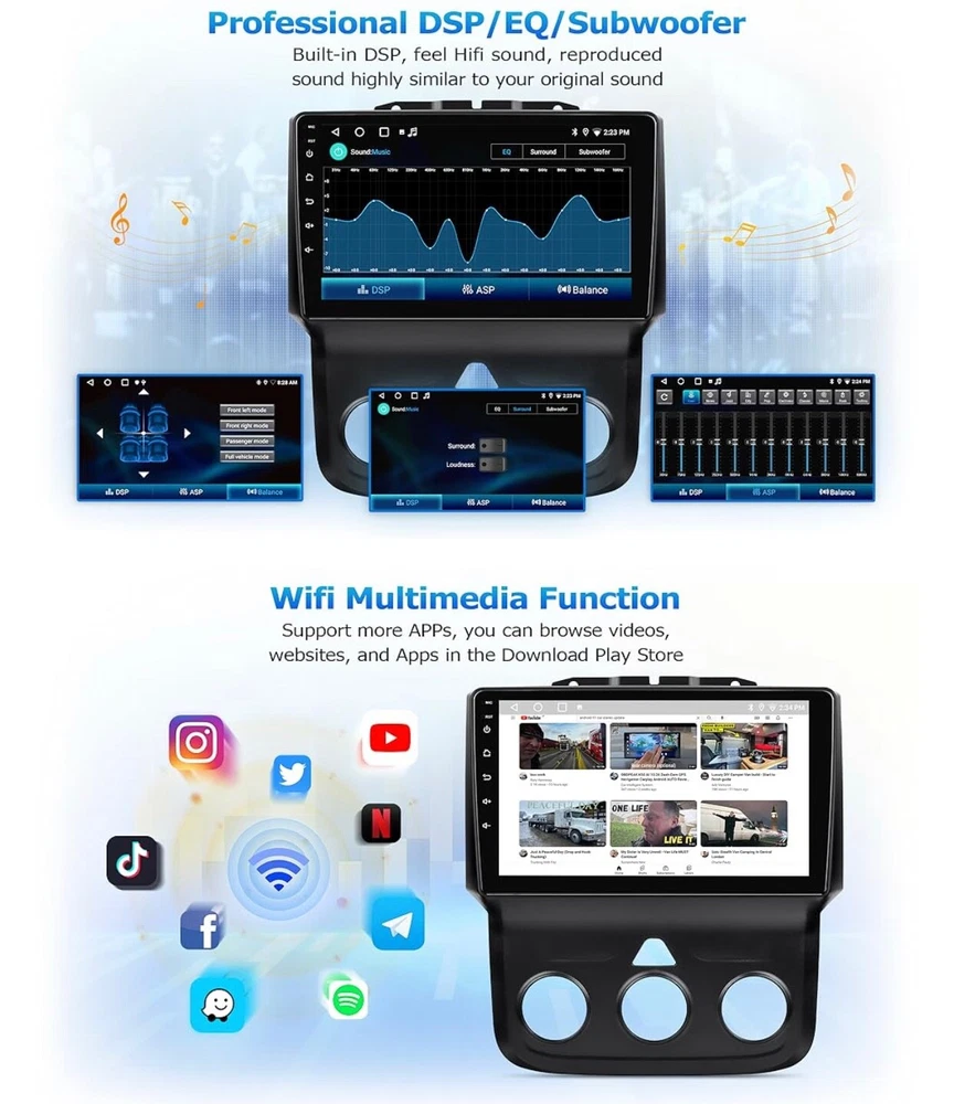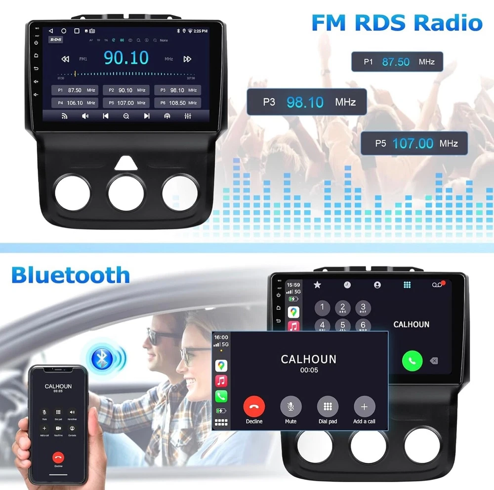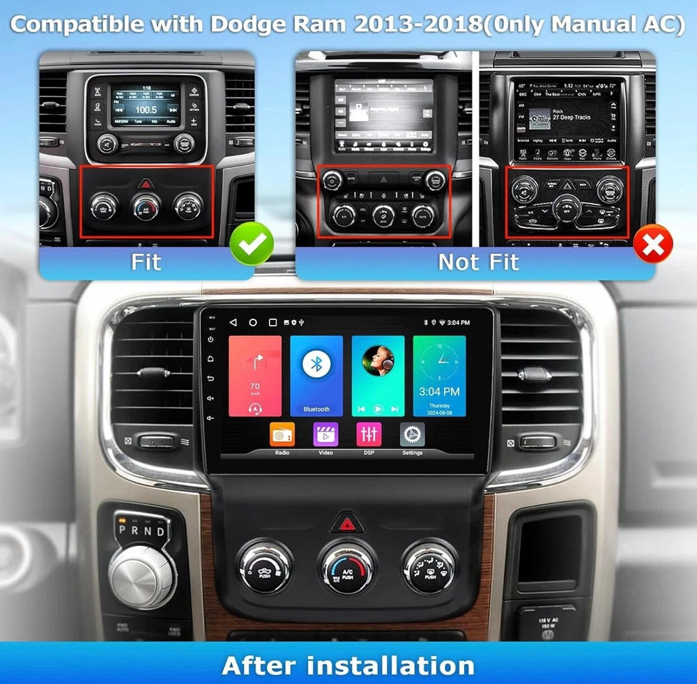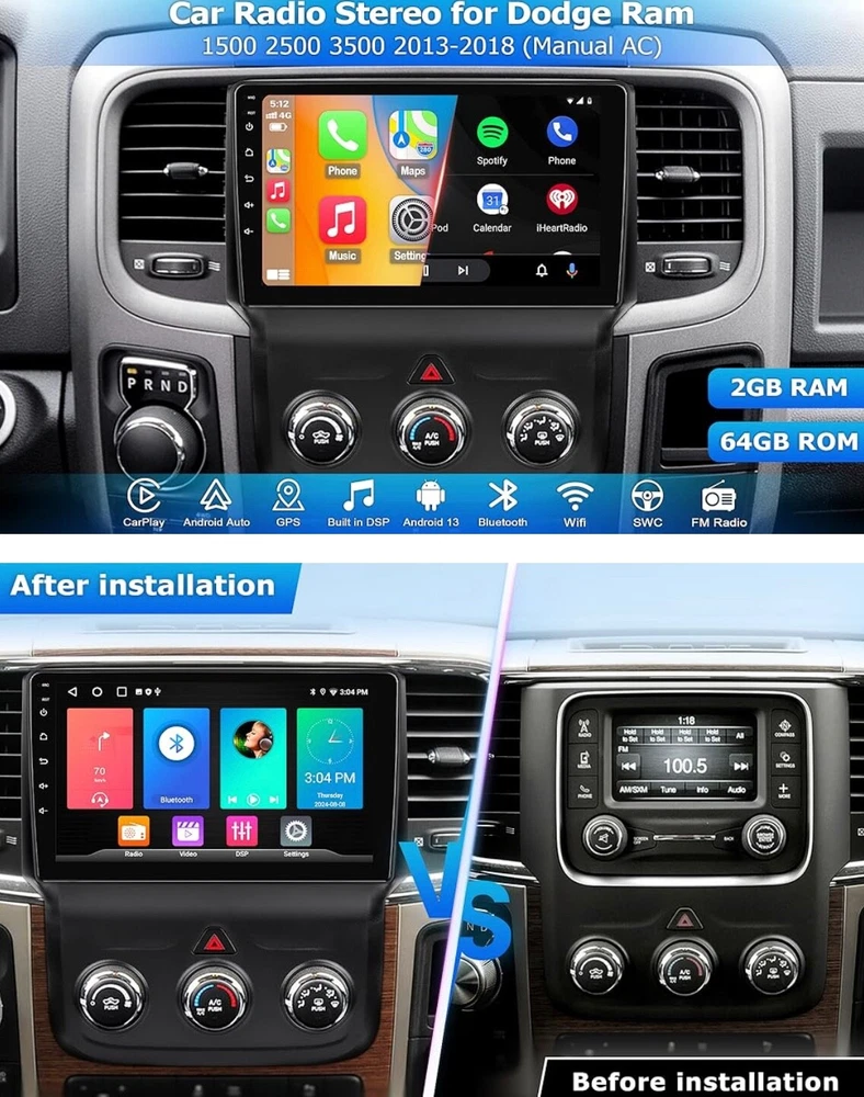 #1140 2+64G Car Radio for Dodge Ram 1500 2500 3500 2013 2014 2015 2016 2017 2018 Built in CarPlay Android Auto, 9 Inch Touch Screen Stereo Replacement, Support GPS BT FM DSP WiFi(Only fit Manual AC) Brand: LOVPOI Vehicle Service Type: Car Screen Size: 9 Inches Special Feature: Touchscreen, Bluetooth, Lane Assist Connectivity Technology: Bluetooth, Wi-Fi, USB 【 Applicable Car Models 】 Car Radio for Dodge Ram 1500 2500 3500 2013 2014 2015 2016 2017 2018 (only fit Manual AC). Please check the year, dimensions, and shape of the center console of your vehicles before purchasing. 【 Built in Carplay & Android Auto 】 LOVPOI car stereo for Dodge ram 1500 2500 3500 2013-2018 is compatible with wireless CarPlay and Android Auto. Simply connect your iPhone or Android phone to the Android 13 Dodge ram radio via Bluetooth, Easily access your phone to navigate, make calls, play music, or other apps via Siri/Google controls. Enjoy a more seamless and convenient in your car. 【 High Configuration 】 Featuring the Android 13 operation system with 9 inch 1920*1080 high-resolution touch screen, offers you a clear visual experience. Built-in 2GB RAM & 64GB ROM, high performance & low power consumption ensure the Dodge Ram radio runs smoothly. 【 GPS Map & WiFi Connect 】 Built-in GPS module, support online/offline navigation apps on Google Play Store via WiFi function. Use updated data in the navigation app to make driving easier and safer. Car radio can install or remove apps from the app store just like a smartphone, such as YouTube, Facebook, Maps, and more. 【 Bluetooth/FM Radio 】 This Dodge Ram stereo stays connected with Bluetooth for hands-free calls and wireless music streaming. You will not be distracted while driving, making the journey safer. Also, tune into your favorite radio stations with crystal-clear FM audio. 【 Other Functions 】 ① Built-in DSP 16-band EQ adjust, Support HiFi sound. Can be tuned into your favorite music sound modes, like Pop, Rock, Jazz, Classical, Flat, User, or Voice; ②Split-Screen Mode; ③SWC function; ④Mirror Link Function; ⑤RCA out; ⑥Customize UI interface, etc. What's in the box Touch Screen Radio,Dash kit,Installation Harness