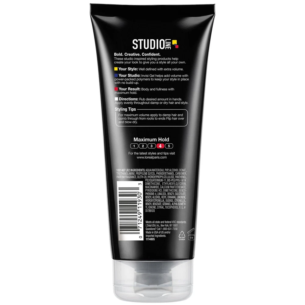 Product Description L'Oreal Paris Studio Line Fullness and Definition Hair Styling Gel 6.8oz L'Oreal Paris Studio Line Fullness and Definition Hair Styling Gel, Get a defined, full look with volume, body and maximum hold using the L'Oreal Paris Studio Invisi Gel. This defining hair gel contains a no-build-up thickening base to add volume to your hairstyle. For maximum volume, apply to damp hair and comb through from roots to ends. Flip hair over and blow-dry. Perfect for short hairstyles and men's hairstyles. Packaging May Vary. Get a defined, full look with volume, body and maximum hold using the L'Oreal Paris Studio Invisi Gel. This defining hair gel contains a no-build-up thickening base to add volume to your hairstyle For maximum volume, apply to damp hair and comb through from roots to ends. Flip hair over and blow-dry. Perfect for short hairstyles and men's hairstyles. The Studio Look- L'Oreal Paris Studio Line Invisi Gel adds fullness, body and volume to your hairstyle Extreme Hold- The Studio Line Invisi Gel offers a well-defined maximum hold to keep your look in place Your Studio- Invisi Gel helps add volume with power-packed polymers to keep your style in place with no build-up Perfect for Styling- The Invisi Gel is perfect for a long-lasting hold for short hairstyles and men's hairstyles For maximum volume, apply to damp hair and comb through from roots to ends; Flip hair over and blow dry Ingredients Aqua/Water/Eau Vp/Va Copolymer Triethanolamine Carbomer Polyquaternium-16 Panthenol Dmdm Hydantoin Peg/Ppg-22/24 Dimethicone Niacinamide Calcium Pantothenate Pyridoxine Hc1 Linalool Iodopropynyl Butylcarbamate Benzyl Salicylate Hexyl Cinnamal Butylphenyl Methylpropional Benzyl Benzoate Limonene Hydroxycitronellal Eugenol Citronellol Hydroxyisohexyl 3-Cyclohexene Carboxaldehyde Geraniol Alpha-Isomethyl Ionone Parfum/Fragrance