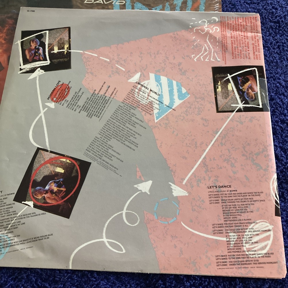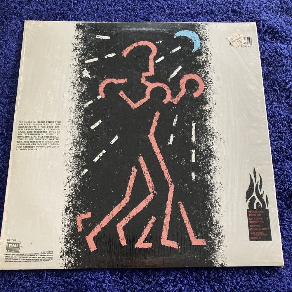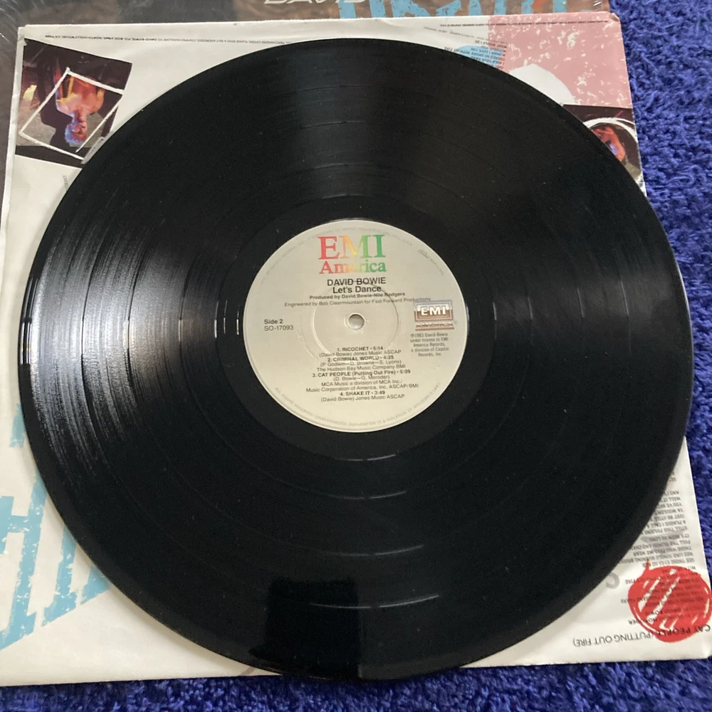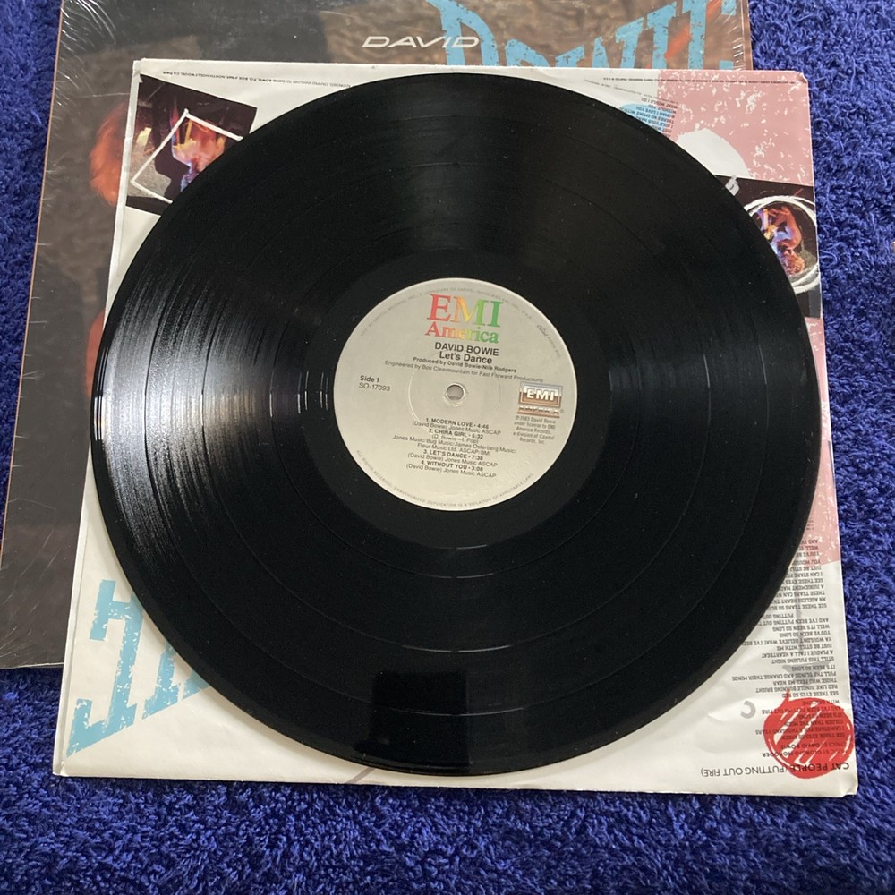 The LP "Let's Dance" by David Bowie, released in 1983 under EMI label, is a high-fidelity vinyl record in a 12" format. Produced by Nile Rodgers, this is a collectible item for fans of David Bowie and 1980s rock music. Stevie Ray Vaughan and Nile Rodger’s on guitar.