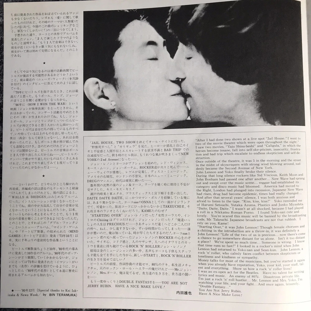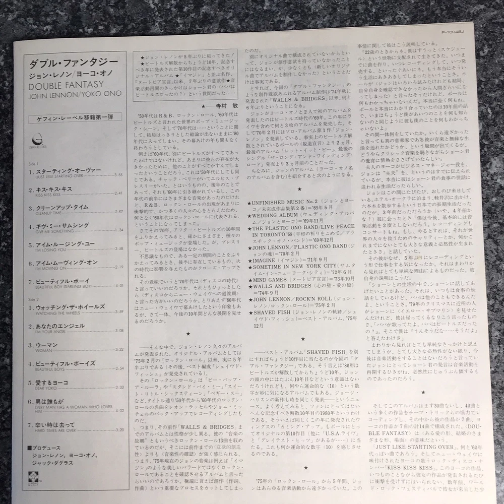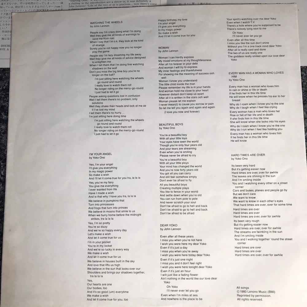 Track List A1 (Just Like) Starting Over Written-By, Lead Vocals [Uncredited] – John Lennon 3:55 A2 Kiss Kiss Kiss Written-By, Lead Vocals [Uncredited] – Yoko Ono 2:41 A3 Cleanup Time Written-By, Lead Vocals [Uncredited] – John Lennon 2:57 A4 Give Me Something Written-By, Lead Vocals [Uncredited] – Yoko Ono 1:34 A5 I'm Losing You Written-By, Lead Vocals [Uncredited] – John Lennon 3:58 A6 I'm Moving On Written-By, Lead Vocals [Uncredited] – Yoko Ono 2:19 A7 Beautiful Boy (Darling Boy) Steel Drums – Robert Greenridge * Written-By, Lead Vocals [Uncredited] – John Lennon 4:01 B1 Watching The Wheels Dulcimer [Hammer] – Matthew Cunningham Written-By, Lead Vocals [Uncredited] – John Lennon 3:59 B2 I'm Your Angel Arranged By [Horns] – Tony Davilio Written-By, Lead Vocals [Uncredited] – Yoko Ono 3:08 B3 Woman Written-By, Lead Vocals [Uncredited] – John Lennon 3:32 B4 Beautiful Boys Written-By, Lead Vocals [Uncredited] – Yoko Ono 2:54 B5 Dear Yoko Written-By, Lead Vocals [Uncredited] – John Lennon 2:33 B6 Every Man Has A Woman Who Loves Him Written-By, Lead Vocals [Uncredited] – Yoko Ono 4:02 B7 Hard Times Are Over Written-By, Lead Vocals [Uncredited] – Yoko Ono 3:20