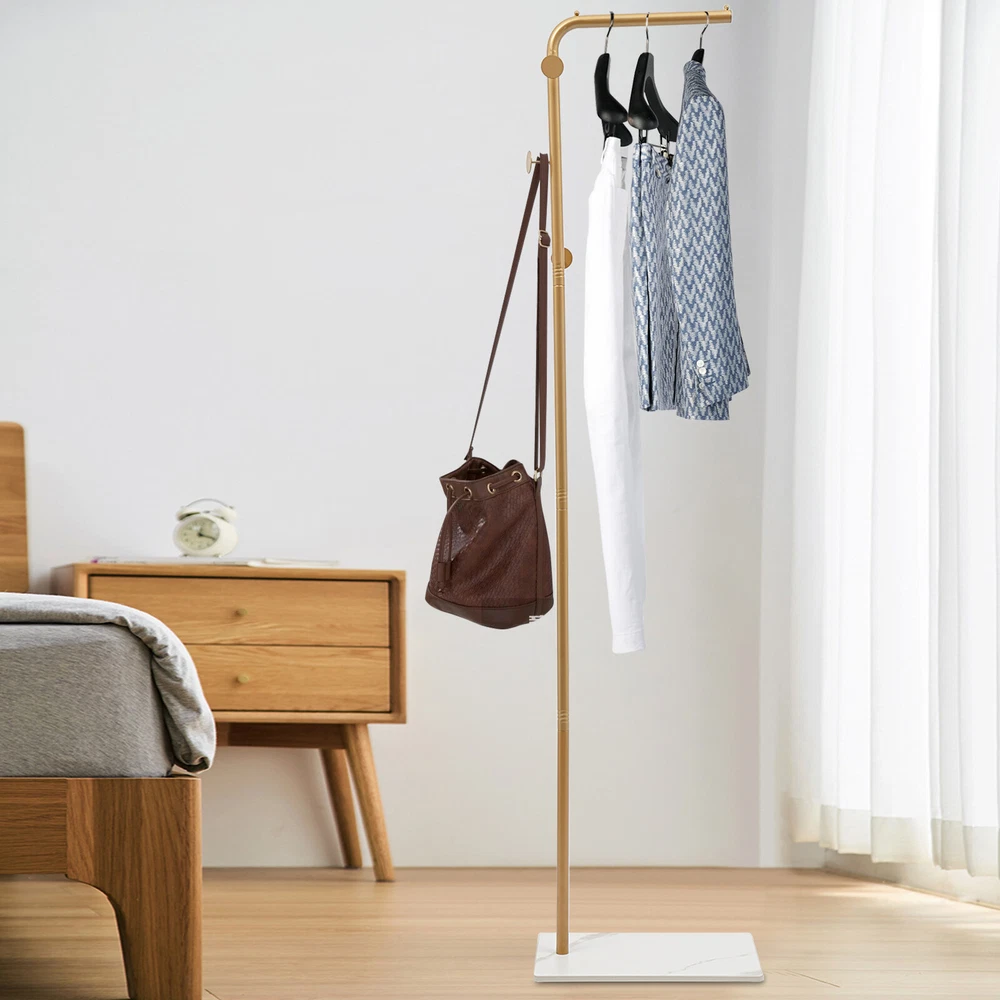 L-shape Coat Rack Hat Bag Stand Tree 3 Hooks Clothes Hanger Umbrella Holder Rack Description Are you still worried about finding a place to hang your clothes? Our coat rack is designed for hanging clothes, bags, scarves and other items in an organized manner. It is made of high-quality iron and slate materials with a high-temperature baking paint process , which is not only beautiful but also durable. It can effectively help you hang and organize all kinds of clothes and solve storage problems in small homes. Come and bring it home! Key Features Sturdy and Durable: This product is made of high-quality iron and slate materials with a high-temperature baking paint process, which is sturdy and wear-resistant , and has a long service life. Fashionable Style: The sleek look, classic gold color and simple lines make for a stylish and elegant product that will go well with your existing furniture and add a splash of color to your room. Strong Load-bearing Capacity : The rectangular base and the strong connection between the parts make this product able to withstand a heavy load of about 77.16lbs , so you can use it to store your daily clothes with confidence. Large Capacity: The 3 left and right distributed hooks add hierarchy and avoid stacking of clothes, making it easy for you to access coats, handbags, scarves and jackets (not included). The top shelf allows you to hang your clothes neatly (not included), and the small rounded ends won't let the hangers slide off. The bottom rock base holds your shoes (not included) for more organized storage. Suitable Height: It is high enough (66.93in) to prevent most clothes from touching the floor and getting dirty, so you can hang your pants, long skirts, coats, etc.(not included) with confidence. Easy Installation: The simple structure allows even novice installers to install it quickly and accurately. Effortless Cleaning: Thanks to the smooth surface, simple structure, and open design, you can easily wipe off the dirt on it with a soft cloth. Ideal Gift: With a beautiful appearance and good performance, it would be a wonderful surprise for your wife, mother, daughter, friend, or loved ones. Protective Package: To prevent damage to the product due to bumps in transit, we place foam to protect the product as much as possible. Details 3 Round Head Hooks: They are not only aesthetically pleasing but also prevent clothes from falling off and care for your clothes and hands. Sturdy Base: The rectangular slate base measuring 15.75*9.84in can well stabilize this product and prevent it from tipping over. 9 Foam Pads: They can be taped to the bottom of the base to protect the floor from scratches. Smooth Edge: The rounded and smooth edges not only add to the aesthetics of the product but also improve the safety of use. Application It can be used in hallways, bedrooms, living rooms, bathrooms, entryways, foyers, study rooms, children's rooms, laundry rooms, offices, clothing stores, apartments, hotels, dormitories, etc. It can be used to hang coats, scarves, hats, school bags, handbags, purses, suits, garments and place shoes etc. Specifications Color: Gold, White Style: Modern Material: Iron, Slate Shape: L-shape Process: High-temperature Baking Paint Assembly Required: Yes Mounting Type: Free Standing Total Load Capacity: About 35kg/77.16lbs Number of Hooks: 3 Gross Weight: 3.75kg/8.27lbs Net Weight: 3.5kg/7.72lbs Product Height: 170cm/66.93in Rod Length: 30cm/11.81in Base Size(L*W): 40*25cm/15.75*9.84in Package Size: 51*40*12cm/20.08*15.75*4.72in Package Included 1* Coat Rack 9* Foam Pads All Accessories for Assembly Notes Please note that this product does not include any clothes. Please do not leave the product in the sun or a humid place for a long time, otherwise, it will reduce the service life of the product. Please allow the slight color difference caused by the shooting light and 1-3cm error due to manual measurement, and make sure you do not mind before you order. Payment Delivery details Terms of sales About us Contact us Payment We accept ebay payment 。 Fees such as import duties, taxes are not included in the item price or shipping costs. These charges are the buyer's responsibility. Delivery details Shipping: 2-9 working days to: USA Terms of sales We maintain high standards of excellence and strive for hundred percent customer satisfaction. Feedback is very important to us. We hope that you contact us immediately before you give neutral or negative feedback, so that we can address your concerns. It is impossible to address issues if we do not know about them! About us Your satis faction is our ultimate goal. We work hard to earn your trust and future business. Our certified technicians have tested each item before shipping. The unit comes with 1 year limited warranty on all manufacturing defects. a) If you receive a defective item, you may return it or ask for a discount. Please contact us within 14 days after you receive the package. b) What you returned must be intact and in its original packaging as re? u. Customer is responsible for shipping costs of the returned item. c) We will cover the cost of shipping back t with the shipping rate indicated in the registration page. We will send you a new unit or refund the full payment you paid. Thank you. Contact us Business Hour Business Hour: Monday To Friday: 8:30 AM to 5:00 PM (Beijing China time) Due to time zones, our reply to your questions may not be immediately. But within above working time, we will reply your email within 24 hours. If it's non-workdays, please kindly be patient and wait till Monday. Please contact us with ebay message. Please feel free to contact us if you have any questions. Monday To Friday: 8:30 AM to 5:00 PM (Beijing China time) Due to time zones, our reply to your questions may not be immediately. But within above working time, we will reply your email within 24 hours. If it's non-workdays, please kindly be patient and wait till Monday. Please contact us with ebay m