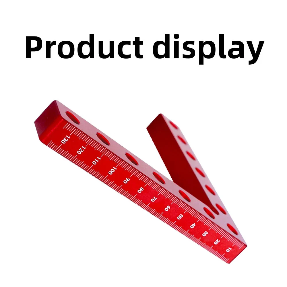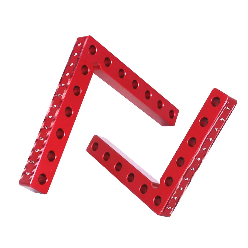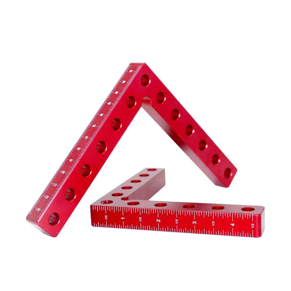 【Premium Material】Made of aluminium alloy, it will lasts for years. Anodized red surface, durable and resistant to corrosion, rust prevention. 【L-Type Design】L-Type positioning square, with accurate metric/inch scale and different fixing holes, is convenient for you to measure length, position, etc. 【Easy To Use】Beveled edges, Perfect 90° Corners, easy to handle and will not damage the fragile cutting edges, just place a square on the corner of the two stock pieces to square and secure with a set of clamps. Excellent ergonomic design for gripping power which can help to set up quickly, providing you a comfortable and safe using process. 【Wide Application】This Carpentry right angle jig set designed to be clamped to boxes, picture frames, drawers,frames, shelf cabinets, 90 degree weld and for outside corners. Practical DIY tool to make your woodworking project easier. 【What You Get】4* Positioning Squares and 8* Clamp Hooks