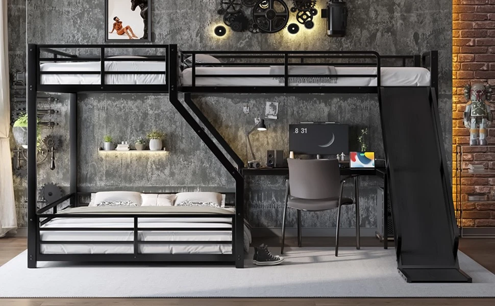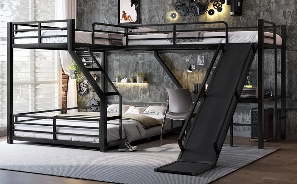 L-Shaped Metal Triple Bunk Bed Twin XL over Queen Bed Frame w/Twin Size Loft Bed Features 【Space-Saving Triple Bunk Design】This metal triple bunk bed combines a twin xl over queen and a twin loft, offering three sleeping spaces in one compact frame. Perfect for large families, sleepovers, or guests, it maximizes vertical space while keeping your bedroom neat and organized. 【Fun Slide & Modern Touch】Equipped with a detachable slide, this queen over twin bunk bed adds an element of play and excitement for kids. Plus, integrated USB ports allow convenient charging for phones, tablets, or other devices, combining fun with everyday functionality. 【Sturdy & Stable Metal Frame】Crafted with a heavy-duty steel frame, this triple bunk bed ensures long-lasting durability and stability. Reinforced metal slats provide reliable mattress support, eliminate the need for box springs, and reduce sagging for years of comfortable use. 【Noise-Free & Safe Design】The twin and twin XL over queen bunk bed is equipped with full-length guardrails, secured ladders, and anti-noise rubber plugs to ensure safety and a quiet night’s sleep. Ideal for both kids and adults, offering peace of mind and comfort. 【Easy Assembly with Instructions】This triple bunk bed with slide and USB ports comes with all the tools and illustrated instructions needed for quick setup. Clearly labeled parts make assembly simple, so you can enjoy a functional, stylish, and secure bed with ease. Descriptions Product Description Upgrade your bedroom with this Twin XL and Queen over Twin Metal Triple Bunk Bed with Slide and USB Ports, a perfect blend of space-saving design, fun features, and modern convenience. With three sleeping areas— twin, twin XL, and a queen bed—this triple bunk is ideal for large families, shared rooms, or hosting overnight guests. The detachable slide adds a playful touch for kids, while built-in USB ports make charging devices effortless. Crafted from a sturdy steel frame with reinforced slats, it delivers strong mattress support without needing a box spring. Safety is prioritized with full-length guardrails, secure ladders, and noise-reducing rubber plugs for a quiet, restful sleep. Its sleek black finish complements any room style, while the included instructions and tool kit ensure easy assembly. This bunk bed combines practicality, durability, and modern design to make the most of your living space. Weight & Dimensions Product Type Metal Triple Bed Color Black Size Twin XL/Queen Material Metal+MDF Overall Product Dimension 117.72”L*82.68’’W*57.08”H Overall Product Weight 177.70 LBS Weight Capacity 500LBS Number of Each Bed Slats 19pcs for Twin, 20pcs for Twin XL&Queen Recommend Mattress Thickness 6'' for Upper Bed,8'' -10''for Bottom Bed Number of Package 3 Package Dimension & Weight Please refer to the Specification Level of Assembly Full Assembly Needed Eligible for Hardware Packs Yes Country of Origin China Note All the pictures are taken by actual samples, slight chromatic aberration may occur due to lighting or display.