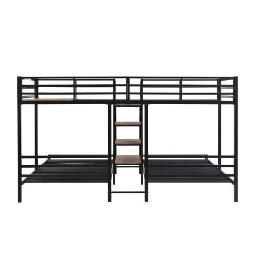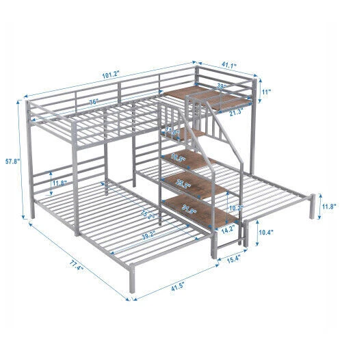 L-Shaped Triple Bunk Bed with Stairs, Metal Twin Over Twin & Twin Bunk Bed Features [Sturdy Metal Frame] Made of solid metal frame, the bunk bed is durable and reliable for you bedroom.Surrounding with high guardrail on upper bed, no need to worry about safety when sleep alone. [Space Saving Design] Three beds in one, while this bed provides a solution for multi-person accommodation, it also greatly saves space. [Multiple Storage Space] The 4-tier shelf is both a storage shelf and a staircase. The upper bed also comes with a 21.3" x 39" plank where you can put toys and more. Theres spacious space under the down beds. [No Box Spring Required] The slats support the mattresses not to slide and increase the service life. [Easy Assembly] All parts included in your package are indicated clearly. With step-by-step installation manual and per-drilled holes, you can easily assemble this bed individually. Manual installation is recommended. Description Metal Twin over Twin & Twin Bunk Bed, Triple Bunk Bed with Storage Shelves Staircase, Black This metal bunk bed features three beds in one, truly a space-saver. With a twin size bed on top and two twin size beds underneath, this bed is ideal for accommodating guests and sleepovers, and also perfect for family with multiple members. The staircase between beds is available for storage and the down bed is 10.4" off the floor, so there's spacious space under the down beds, you can use it to store your stuff. The top bed is equipped with full-length guardrail, keeping user's safe from falling. Coming with great quality and multiple function, this bed will be the best addition to your bedroom. Description Material Metal+MDF Size Twin Color Black Numbers of Package 2 Spring Box No need Assembly Required Yes Origin China Dimensions Overall Product Dimension 101.2''L x 77.4''W x 57.8''H Package Dimension Please refer to the Specification Upper Bed 76'' x 39'' Down Bed 75.2'' x 39.2'' Total Height 57.8'' Number of Bed Slats(Upper/Down) 22pcs/22pcs/22pcs Recommend Mattress Thickness of Bed(Upper/Down) 6''/8-10'' Overall Product Weight 180lb Bed Weight Capacity(Upper/Down) 300lb/300lb