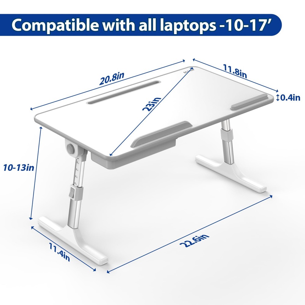 LT05 Adjustable Laptop Table, Portable Standing Bed Desk, Foldable Sofa Breakfast Tray, Notebook Computer Stand for Reading and Writing Height Adjustment Easy Adjustable 5 Height Positions from 9.4” to 12.6”. Pull up--Pull out the table footing to your desired height and it will be locked automatically without taking any further action. Pull down-- Press the lock button and press the table gently to the desired height, then release the lock button, it will be locked automatically. Angle Adjustable 0°-36° angle adjusting without a pause. Hold and press the two sides lock button at the same time, you can easily adjust the slope of desktop; adjust to the appropriate slope, then release the two side lock button to lock it down. Easy Carry and Storage Retractable legs could fold below the table for easy storage and carry. You could use it anywhere in your home or office. Anti-slip Baffles for laptop and mouse Laptop baffle could stop the laptop to be slided when you use the table in different angles during operation. Mouse baffle provides a comfortable support when you use it with mouse. Tablet Groove & Storage Drawer Built-in stand groove for supporting tablets and smart phones, and a storage drawer for pens and glasses. Specification: Size: 20.8”x11.8”x0.35” (530x300x9mm) Height Adjustment: 9.4” to 12.6” Tilt Angle: 0° to 36° Loading Weight: Up to 77 lbs (35kgs) Support: Up to 17” Laptop Wide compatibility & Tablet Groove & Storage Drawer: LT05 Laptop table is 20.8”x11.8”x0.35” (530x300x9mm) of size which fits for 17” or larger laptop with space for a mouse. Built-in stand groove for supporting tablets and smart phones, and a storage drawer for pens and glasses. Multiple Uses: This multifunctional table will be a perfect addition to your office or home. You could use it on bed, couch/sofa, desktop and floor. A snack tray for watching TV, a laptop stand for relaxing in bed or a standing table for office or home work. Angle Adjustable: 0°-36° angle adjusting without a pause. Hold and press the two sides lock button at the same time, you can easily adjust the slope of desktop; adjust to the appropriate slope, then release the two side lock button to lock it down. Height Adjustable: Easy Adjustable 5 Height Positions from 9.4” to 12.6”. Simply press the lock button and pull the table leg gently to the desired height. Then release the lock button, it will be locked automatically. Portable: Retractable legs could fold below the table for easy storage and carry. You could use it anywhere in your home or office.