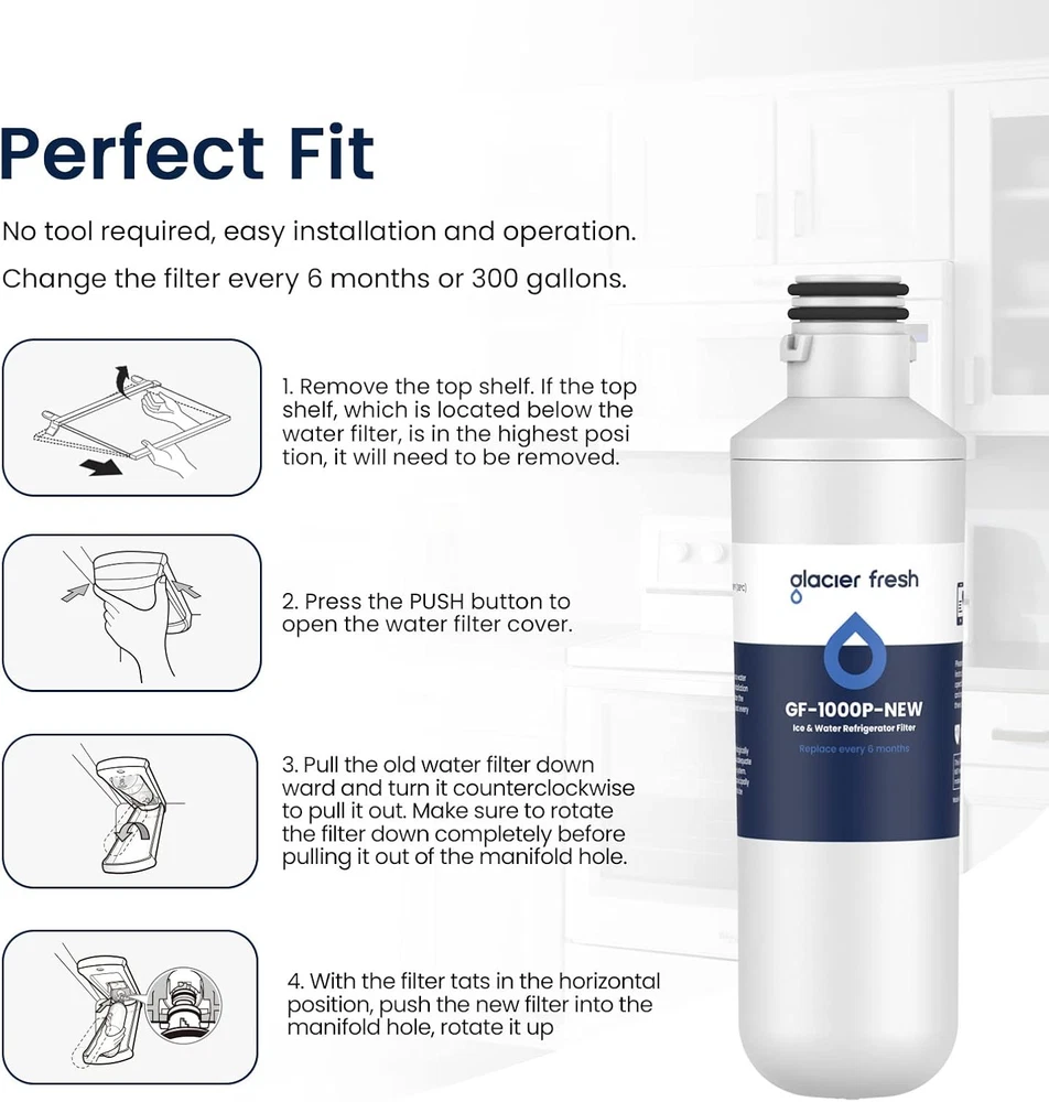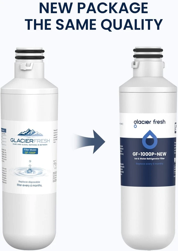 Plastic GLACIER FRESH Water Filter LT1000PC Statement: Material and Construction and Performance Tested to NSF42 Standards. Tested & verified by independent laboratory testing, the GF-1000P Samsung* refrigerator water filter removes 97.9%* chlorine and improves water’s smell and taste. LT1000PC Water Filter Compatible: LT1000P/PC/PCS, ADQ74793501, MDJ64844601,ADQ747935 ADQ74793504 Water Filter, Kenmore 46-9980, 9980, ADQ74793502 etc. Find NSF 42 Standard information: Go to NSF's database, the manufacturer "Ningbo Pureza Technology, LLC" and model number "GF-1000P". If you find that the product is not NSF42 certified, you can apply for a ten-fold claim for the purchase amount, this claim statement is listed for GLACIER FRESH and has nothing to do with NSF LT1000PC Water filter Service life: Premium coconut shell carbon blocks to minimize contaminants and replace filters every 6 months or 200 gallons. LT120F Air Filter Compatible: ADQ73214404, ADQ73214404, ADQ73334008, ADQ73214402, ADQ73214403, ADQ73214404 refrigerator air filter, kenmore 469918, 46-9918, 9918, kenmore adq73214404 and kenmore elite air filter 9918. LT120F ADQ73334008 Fresh Air Filter: Help keep the air in your refrigerator fresh by removing odors. Helps keep food tasting fresh. Change every 6 months or when the FILTER alert light turns on. (The dimensions for the Fresh Air Filter are 3.1875" x 3.1875".) Product Description 1 Certification Information 2 Find Certification 3 Select Water Filter 4 Enter model number