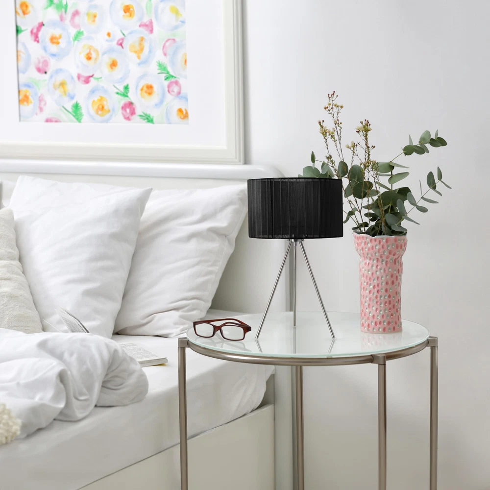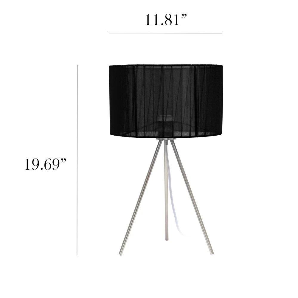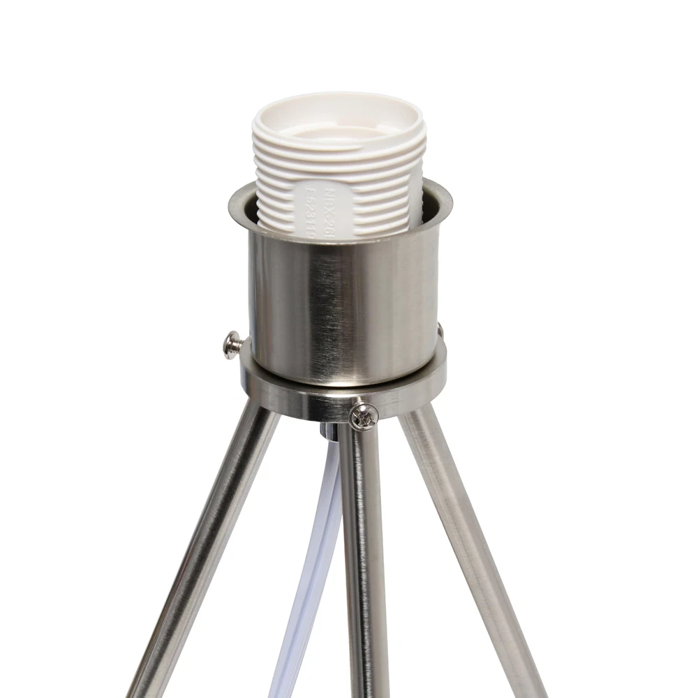 Elevate your contemporary decor with this sleek and modern three-legged brushed nickel table lamp. This table lamp seamlessly combines form and function, providing both a stylish statement piece and a practical lighting solution for your modern living space. CONTEMPORARY DESIGN: Crafted with both simplicity and elegance in mind, this brushed nickel table lamp paired with a chic and streamlined fabric drum shade exudes a polished, modern aesthetic. BULB REQUIREMENT SOLD SEPARATELY: This table lamp uses 1 x 60 watt equivalent type A medium base bulb, which is not included in your purchase but can be easily found online or at your local hardware . ADDITIONAL SHADE COLORS AVAILABLE: Additional shade colors are available. If this shade color doesn't perfectly match your space, make sure to check out other options! PRODUCT SIZE: Overall product size is L: 11.81" x W: 11.81" x H: 19.69" and weighs 1.54 lbs. ASSEMBLY & USE: Product will need to be assembled. A step by step instruction manual is included with your purchase.