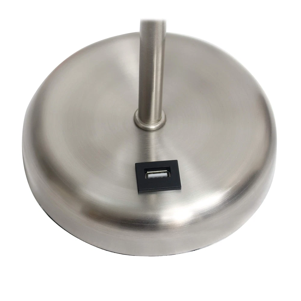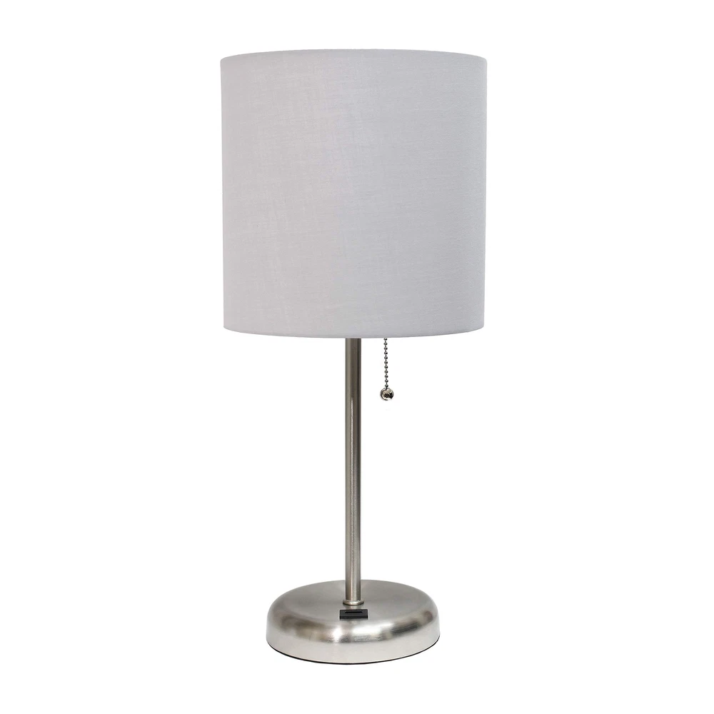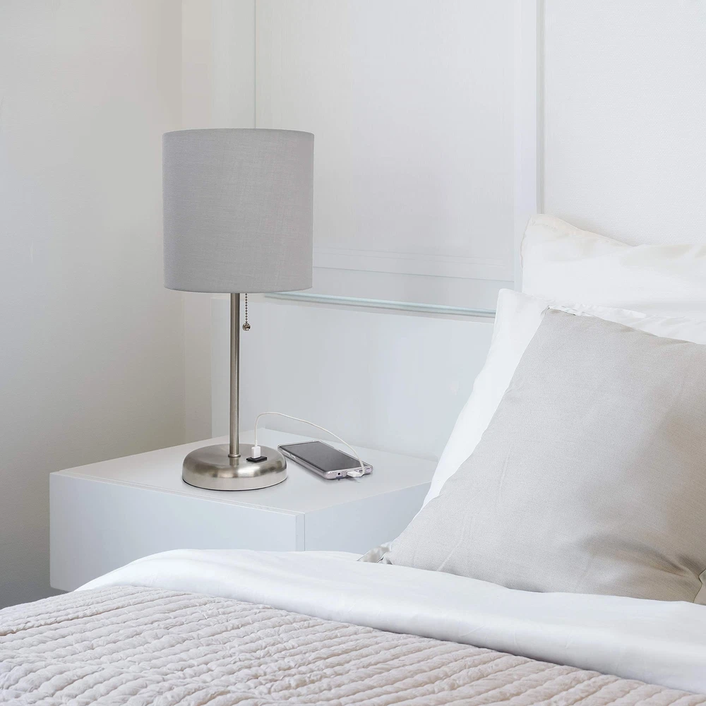 CLEAN MODERN LOOK: A solid colored drum fabric shade accompanies a brushed steel base giving you a slim silhouette and contemporary style lamp for your lighting needs. USB CHARGING PORT FEATURE: You won't need to find that wall outlet behind your furniture anymore! This table lamp is equipped with a USB charging port on the base for charging your cellphone, iPad, iPod, iPhone, and other electronic devices. ADAPTABILITY: This table lamp set with charging capabilities are ideal for just about any space whether in a bedroom, kid's room, nursery, office, or college dorm! Base measures a diameter of 5.25". SIZING: This table lamp measures in at L: 8.5" x W: 8.5"x H: 19.5" while its shade measures Dia 8.5": x H: 8.5". The included plug in cord measures 5'. BULB REQUIREMENT: Each lamp uses 1 x 60W equivalent Type A medium base bulb, which is not included in your purchase. ADDITIONAL OPTIONS AVAILABLE: This lamp is sold in a variety of base and shade combinations. If this base/shade combination doesn't perfectly match your space, make sure to check out other options.