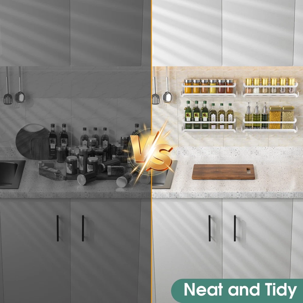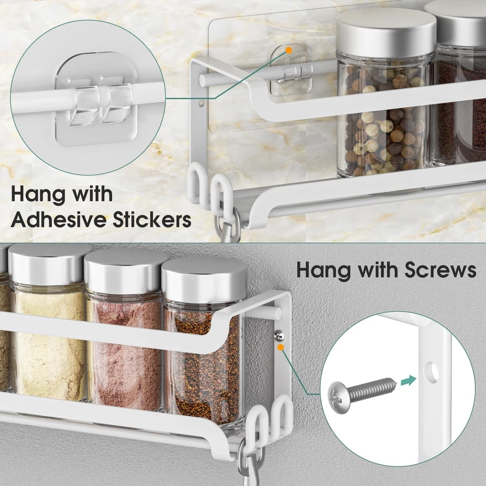 Premium spice rack cabinet door spice rack set is stylish and fits any decor in your kitchen or pantry. Made of sturdy iron with a finish, it's durable and keeps your space sleek and organized. Stable Guardrail & Wider Adhesive Stickers - Our spice rack organizer for cabinet door added side guards and improved two-in-one wider adhesive stickers for increased safety and stability. The adhesive spice racks have guard rails prevent spice from falling, while the wider and stronger stickers provide extra protection and peace of mind in your busy kitchen Sturdy Spice Rack with 16 Hooks - The premium metal cabinet door spice rack is meticulously crafted with powder-coating for enhanced durability and rust resistance. The pantry door spice rack organizer comes with 2 hooks on both sides(4 pack total 16 hooks), so you can easily hang bottle openers, scissors and some other light items.Purpose-built to ensure practicality, versatility, and strength, our wall mount spice rack for cabinet door can be safely used in domestic and commercial spaces Two-Installation Options - Our spice rack organizer for cabinet door has two installation methods: punch-free and perforated, free choice, convenient and quick. Wall mount spice rack Equipped with two different sizes of screws, which can be firmly fixed on the wall (thin doors/hollow doors are not recommended); the cabinet spice organization are also strong adhesive stickers that provide a drill-free suspension solution, which is easy Install without damaging the wall or door(best for flat surfaces) Ideally Sized Spice Organizer - 2.36x2.75x12 inch, Each hanging spice rack shelf provides space for regular sized spice jars (up to 2" ). The cabinet door spice rack organizer has closed sides to keep glass spice jars from falling out either end. Keep your seasoning perfectly organized with the wall mount spice rack & enjoy easy access at all times Hang Just About Anywhere - The small spice rack organizer for cabinet door can be mounted on your wall, inside your stove or pantry/cabinet door, bathroom, or RV. Experience the choice according to your needs with these space-saving wall mount spice rack. The cabinet door spice organization features a straight forward and functional design that can easily complement any space