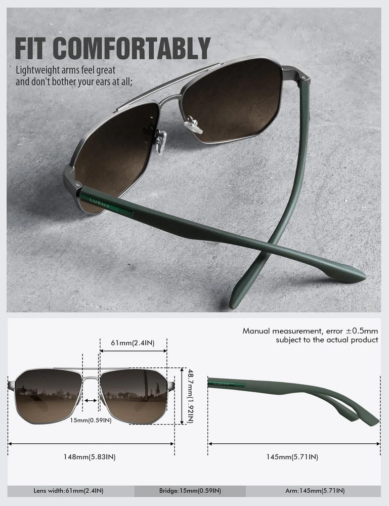LUENX Aviator Sunglasses for Men Square Polarized Polygon Lens - UV 400 Protecti Features: [SQUARE AVIATOR STYLE WITH POLARIZED LENS] :UV400 eye protection effectively filter & block glares. Designed for driving & outdoor activities;High-definition lens gives you a natural & clear vision;Sturdy & Shatterproof; [THE FRAME IS UNIQUELY DESIGNED WITH DELICATE STRIPES] :The delicate thickened striped frame design makes the sunglasses more textured and more sturdy. Larger Men Size:Lens width:61 mm(2.4 inches)/Frame width:148 mm(5.83 inches)/Bridge with:15 mm [LIGHT WEIGHT ONE-PIECE PLASTIC TEMPLES ] :Most of the sunglasses use assembled temples, but this sunglasses use a new type of One-piece temples, to avoid the situation that the arm will be detached during use.Matte Arm with Reinforced Metal Hinges make the frame durable and comfortable.The Arm made with " LUENX "metal logo, premium texture, not easy to peel off.These design ingenuities will make you more unique and fashionable! [ADJUSTABLE NOSE PADS ] : We picked New ultra-light & comfort silicone nose pads for these sunglasses, which can adapt to different nose shape, reduce the burden on the bridge of the nose. [GIFT IDEAS PACKAGE] : First Choice as a Gift.Square Aviator Style for Men.Good for Driving & All Outdoor Activities for all Day;Elegant Glasses Accessories(Soft Glasses Cloth,Soft Glasses Pouch,Exquisite Packaging Carton,Polarized Test Card) Details: Description ➤Why You Should Choose LUENX Sunglasses? Because if you buy expensive sunglasses, you have to worry about scratching or losing on vacation. Because if you buy cheap sunglasses, you have to worry about the quality and the safety whether it is potentially harmful to your eyes.Also cheaply made material and design are too low-grade to wear. ➤ But LUENX, with the highest value for money in the sunglasses industry, enables you to spend a small amount of money to buy a pair of high quality sunglasses. Each pair of sunglasses is 100% polarized lenses with UV 400 protection , giving you full protections when driving or outdoor activities. Stylish designs fit in well any cloth matching. ➤Product Features 1.Polarized HD lenses filter out reflected glare and UV rays to protect your eyes. 2. Upgraded and thickened metal hinges make the sunglasses more sturdy. 3.Unique aviator design complements various face shapes. 4.Ideal for outdoor activities like driving, hiking, traveling, and sports. 5.Unisex sunglasses make a great gift for family and friends. ➤Accessories 1x Sunglasses 1x Soft Glasses Cloth 1x Soft Glasses Pouch 1x Exquisite Packaging Carton 1x Polarized Test Card Features: [SQUARE AVIATOR STYLE WITH POLARIZED LENS] :UV400 eye protection effectively filter & block glares. Designed for driving & outdoor activities;High-definition lens gives you a natural & clear vision;Sturdy & Shatterproof; [THE FRAME IS UNIQUELY DESIGNED WITH DELICATE STRIPES] :The delicate thickened striped frame design makes the sunglasses more textured and more sturdy. Larger Men Size:Lens width:61 mm(2.4 inches)/Frame width:148 mm(5.83 inches)/Bridge with:15 mm [LIGHT WEIGHT ONE-PIECE PLASTIC TEMPLES ] :Most of the sunglasses use assembled temples, but this sunglasses use a new type of One-piece temples, to avoid the situation that the arm will be detached during use.Matte Arm with Reinforced Metal Hinges make the frame durable and comfortable.The Arm made with " LUENX "metal logo, premium texture, not easy to peel off.These design ingenuities will make you more unique and fashionable! [ADJUSTABLE NOSE PADS ] : We picked New ultra-light & comfort silicone nose pads for these sunglasses, which can adapt to different nose shape, reduce the burden on the bridge of the nose. [GIFT IDEAS PACKAGE] : First Choice as a Gift.Square Aviator Style for Men.Good for Driving & All Outdoor Activities for all Day;Elegant Glasses Accessories(Soft Glasses Cloth,Soft Glasses Pouch,Exquisite Packaging Carton,Polarized Test Card) Details: Description ➤Why You Should Choose LUENX Sunglasses? Because if you buy expensive sunglasses, you have to worry about scratching or losing on vacation. Because if you buy cheap sunglasses, you have to worry about the quality and the safety whether it is potentially harmful to your eyes.Also cheaply made material and design are too low-grade to wear. ➤ But LUENX, with the highest value for money in the sunglasses industry, enables you to spend a small amount of money to buy a pair of high quality sunglasses. Each pair of sunglasses is 100% polarized lenses with UV 400 protection , giving you full protections when driving or outdoor activities. Stylish designs fit in well any cloth matching. ➤Product Features 1.Polarized HD lenses filter out reflected glare and UV rays to protect your eyes. 2. Upgraded and thickened metal hinges make the sunglasses more sturdy. 3.Unique aviator design complements various face shapes. 4.Ideal for outdoor activities like driving, hiking, traveling, and sports. 5.Unisex sunglasses make a great gift for family and friends. ➤Accessories 1x Sunglasses 1x Soft Glasses Cloth 1x Soft Glasses Pouch 1x Exquisite Packaging Carton 1x Polarized Test Card eBay integration by