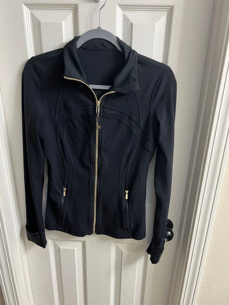 The LULU Women's Define Jacket in black and gold is a slim, high elastic exercise jacket designed for women size 8. Made from nylon, this activewear piece is perfect for yoga or other physical activities. The slimming fit and basic jacket style make it a versatile and stylish addition to any workout wardrobe. With the renowned Lululemon brand and a sleek black color with gold accents, this jacket combines performance and fashion for a flattering and comfortable workout experience.