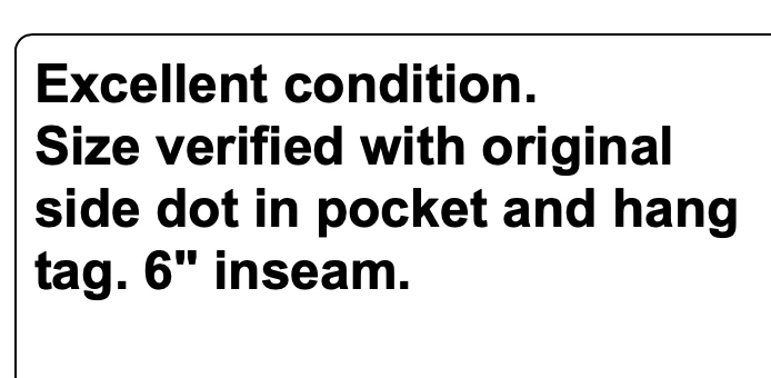 Excellent condition. Size verified with original side dot in pocket and hang tag. 6" inseam. THANK YOU EBAY!!! We are so thankful for our customers! We have thousands of listings, and therefore receive hundreds of messages, every single day. So, if you are asking about a price drop, or a shipping price drop, or asking for extra measurements, or to add additional photos, please allow me to answer you here, No thanks. If your question is not one of those questions, we will be happy to answer you individually. YES...WE DO COMBINE DOMESTIC SHIPPING. Extra jewelry items ship for $2 each (except for large jewelry lots). We will refund the difference as we are mailing out.....we hope you enjoy shopping with us! We encourage you to read the description and check all photos.