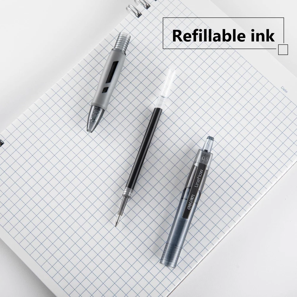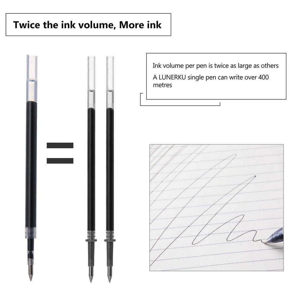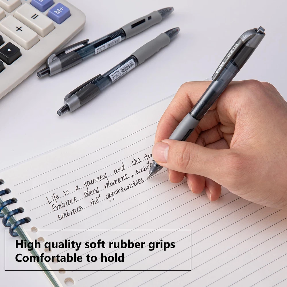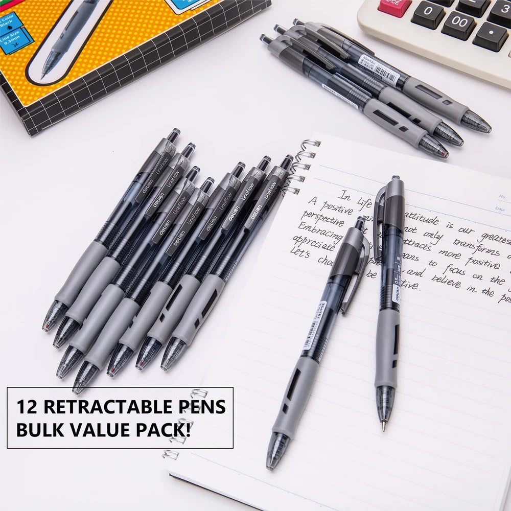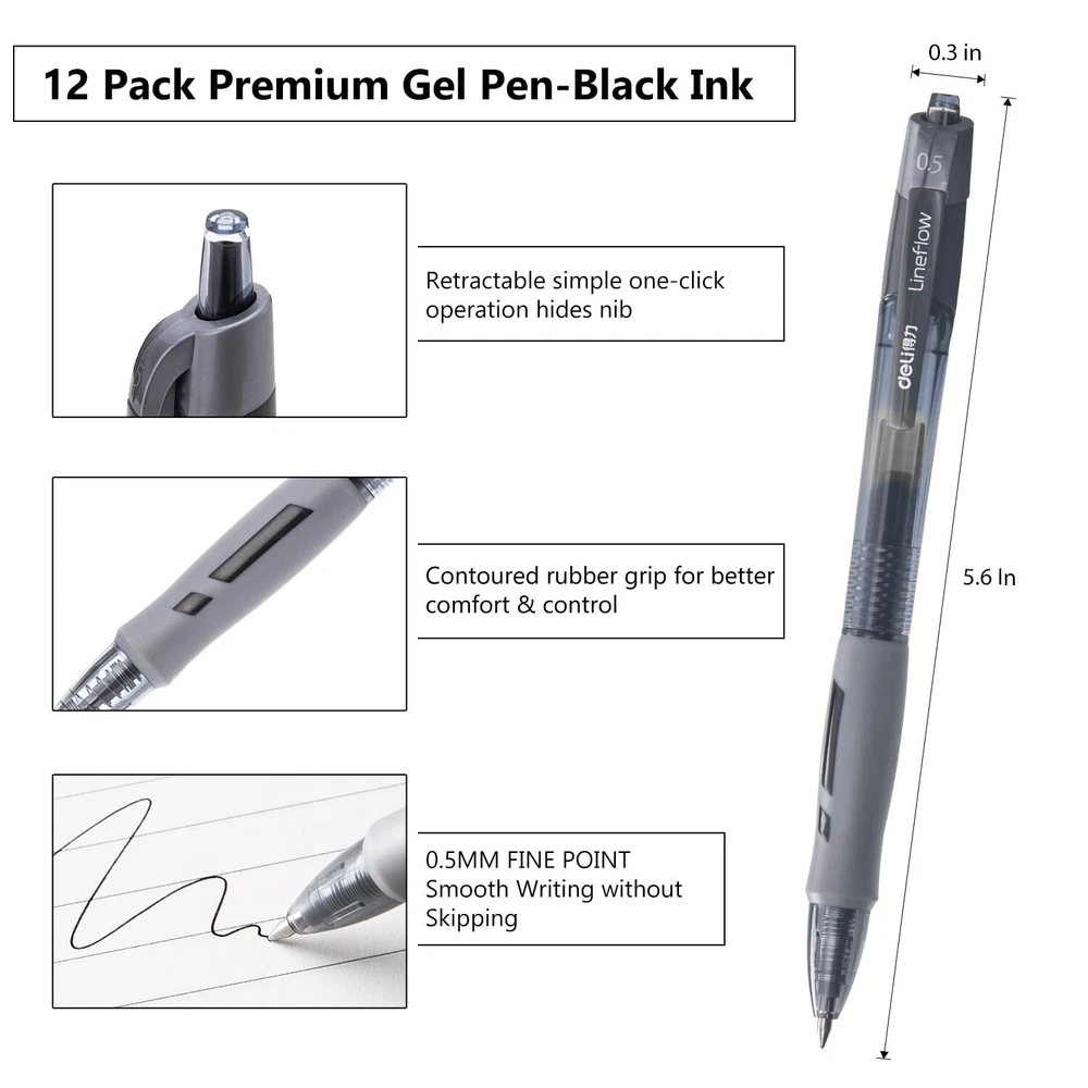 Overview: What your get: 12 pcs Premium LUNERKU Retractable Roller Ball Gel Pens. Specifications: Size: length: 5.7in/14.5cm, diameter: 0.4in/1.0cm. Refill: 0.5mm/0.2in-Black Ink. Color: Black Advantages: ✍️ Perfect Gifts stylish design style, make the pens a great gift for birthdays, back-to-school days, Children’s Day and Christmas Day. It’s good for men women kids girls nurses students teachers friends and co-workers. ✍️ Dry Quickly This journal pens dry quickly, with no leak, no smears, no smudges, and no globs. It's smooth and continuous when writing and drawing. ✍️ Multifunction These pens are great pens for aesthetic school supplies, office supplies, journaling, note taking, and planning. ✍️ Contemporary clip for modern convenience Never lose your pen again! Each LUNERKU pen features a stylish and sturdy clip designed for the fast-paced contemporary lifestyle. Attach it to your notebook, pocket, or bag, and have your writing tool handy whenever inspiration strikes. 12 Pack for Everyday Use- Never worry about running out of ink with the bulk pack of 12 LUNERKU neutral pens. Perfect for all types of writing tasks, from drafting notes to detailed illustration or design work. 0.5mm Tip(Fine)- Achieve clean, precise lines with LUNERKU’s finely designed 0.5mm tip. Perfect for those needing precision in work, study, or creative pursuits. Smooth Writing Experience- Our pens are designed for an ultra-smooth writing experience. Let your words glide on paper effortlessly, ensuring a flawless, uninterrupted flow of ink. Quick-Drying Ink- No more smears or smudges with our quick-drying ink formula. Get peace of mind in every stroke as the ink dries instantly, keeping your words sharp and clear. Comfortable Grip- The LUNERKU neutral pen is designed with a comfortable grip in mind. Long hours of writing won’t be a strain anymore, ensuring optimum comfort and control.